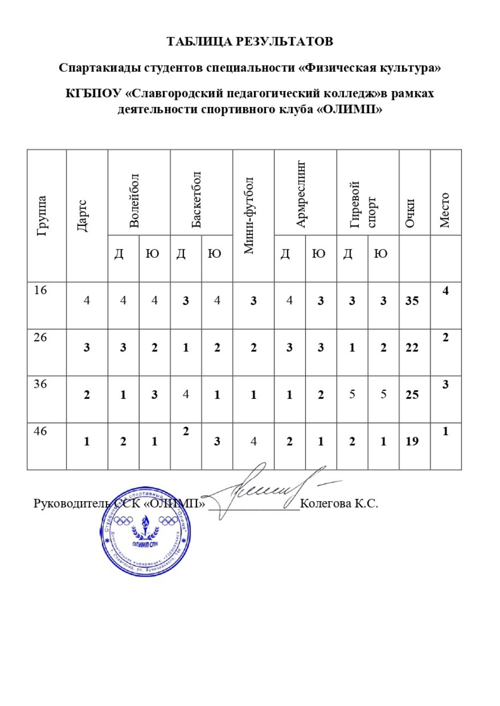 План работы спортивного клуба «ОЛИМП» в КГБПОУ «Славгородский педагогический колледж» в 2025 - 2026 учебном году