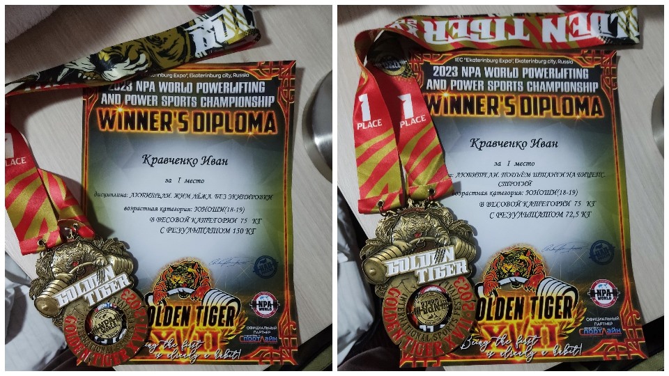 - жим лежа без экипировки, весовая категория 75 кг, результат 150 кг, итог - 1 место