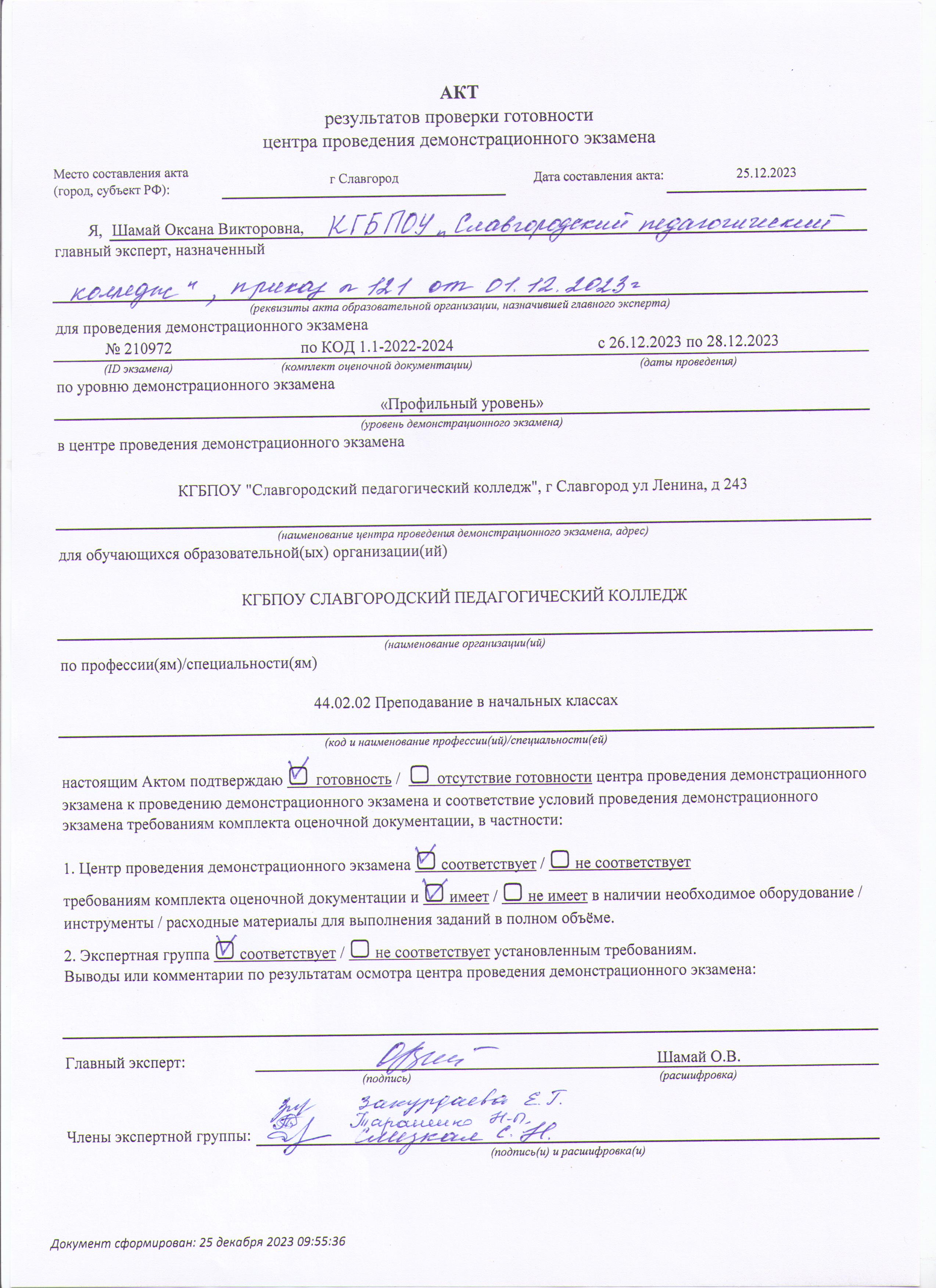 АКТ результатов проверки готовности центра проведения демонстрационного экзамена