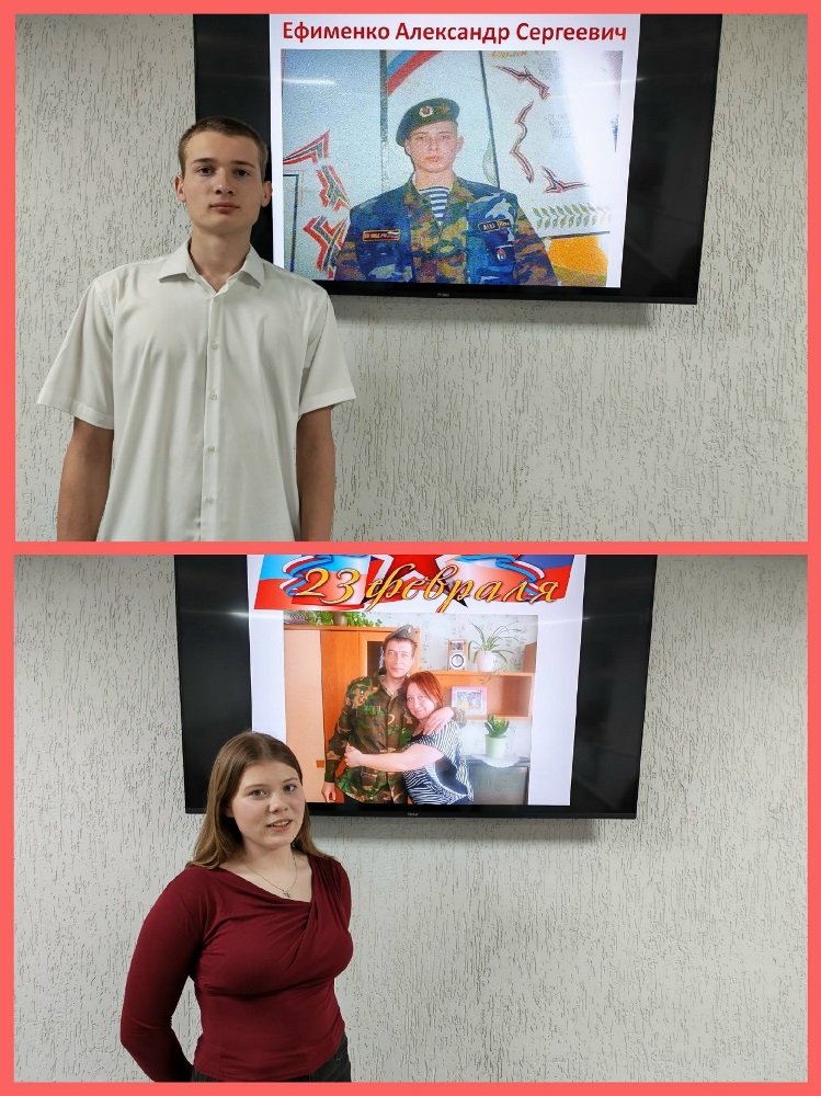 ![]() Час мужества «Герои нашего времени» В рамках Всероссийского месячника оборонно-массовой и военно-патриотической работы в общежитии колледжа прошёл Час мужества «Герои нашего времени». На мероприятии говорили о войне, которая в официальных документах называется по-разному: восстановление конституционности, ликвидация бандформирований, антитеррористическая операция. Но за всеми этими словами – реальные подвиги и реальные потери... Это была та война, на которую уходили мальчишки, едва успевшие повзрослеть. Именно они, вчерашние школьники, стали теми воинами, кому было суждено защищать единство России, её прошлое, настоящее и будущее. Их судьбы оказалась связаны с тяжелейшим испытанием для России – Чеченской войной. Студент 16 группы Артур Шишов рассказал о своём отце – участнике КТО (контртеррористической операции) Виталии Петровиче Шишове. 25.05.2001 он был призван в ряды российской армии для прохождения срочной военной службы. Затем проходил обучение в 242 учебном центре ВДВ. По окончании учёбы был направлен в 331-й гвардейский парашютно-десантный ударный Костромской ордена Кутузова полк (в/ч 71211) в военной должности пулемётчика. Выполнял задачи по обеспечению правопорядка и общественной безопасности на территории СКР РФ (Северо-Кавказской республики). В апреле 2003 был направлен в Москву для подготовки к Параду на Красной площади. Является участником Парада в честь 58-ой годовщины Победы в Великой Отечественной войне (9 мая 2003 года). По окончании военной службы вернулся на родину. В сентябре 2021 встречался с генерал-полковником Владимиром Анатольевичом Шамановым (командующим ВДВ России с 2009 по 2016гг.). Награждён медалями: «За службу на Северном Кавказе», «Защитнику Отечества», «Ветеран ВДВ» и др. Состоит в обществе «Союза ветеранов», является постоянным участников патриотических мероприятий, ведёт активную общественную работу. Через свой личный пример, уважения к традициям и гордости за свою страну прививает сыновьям любовь к Родине! О службе своего отца – Ефименко Александра Сергеевича и его участии в КТО, рассказали студенты 46 группы Даниил и Надежда Ефименко. В армию их папа был призван 4 декабря 2001 года, в 2003 по контракту был переведён в город Аргун. Получил нагрудный знак отличия, подтверждающий квалификацию «Специалист 3-го класса» за освоение сложной военной техники связи, успешную сдачу нормативов и проверку профессиональных навыков, служил в должности заместителя командира роты в 34 ОБРОН (особой бригаде оперативного назначения) внутренних войск МВД. С первых дней эта бригада участвует в СВО. Был ранен – подорвался на растяжке, получил ожог роговиц глаз, но в госпитале зрение спасли. За спасения колонны получил награду «За службу на Кавказе». Является ветераном боевых действий. Также через свой личный пример прививает своим детям любовь к Родине! Огромное спасибо нашим студентам, которые с гордостью рассказали о героях своей семьи. Это так важно, когда память передается из поколения в поколение! Час Мужества стал важным напоминанием для молодого поколения о долге перед теми, кто с честью выполнил свой интернациональный долг. Мы должны помнить и уважать ветеранов, многие из которых живут рядом с нами. Низкий поклон вам, воины-интернационалисты! Мы от души поздравляем всех защитников нашего Отечества с праздником! 