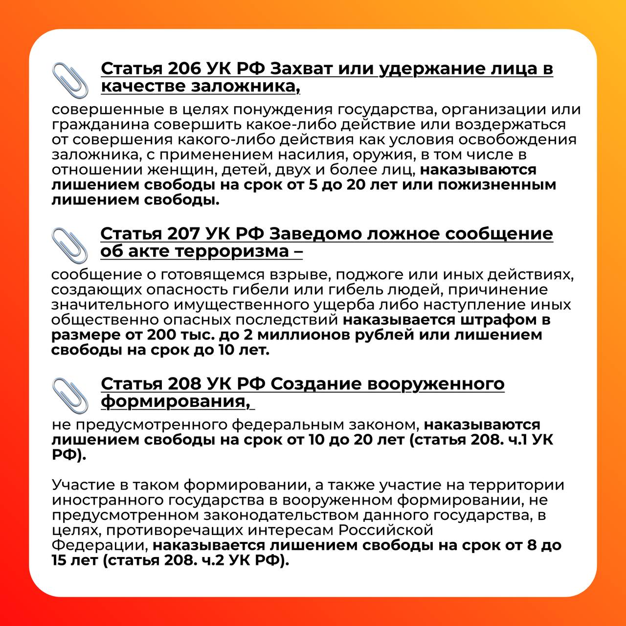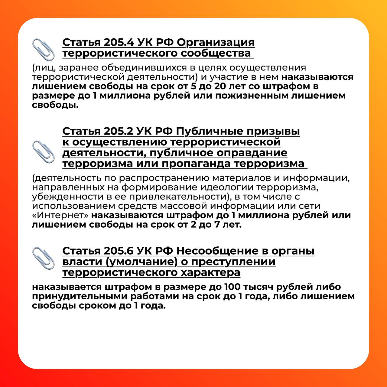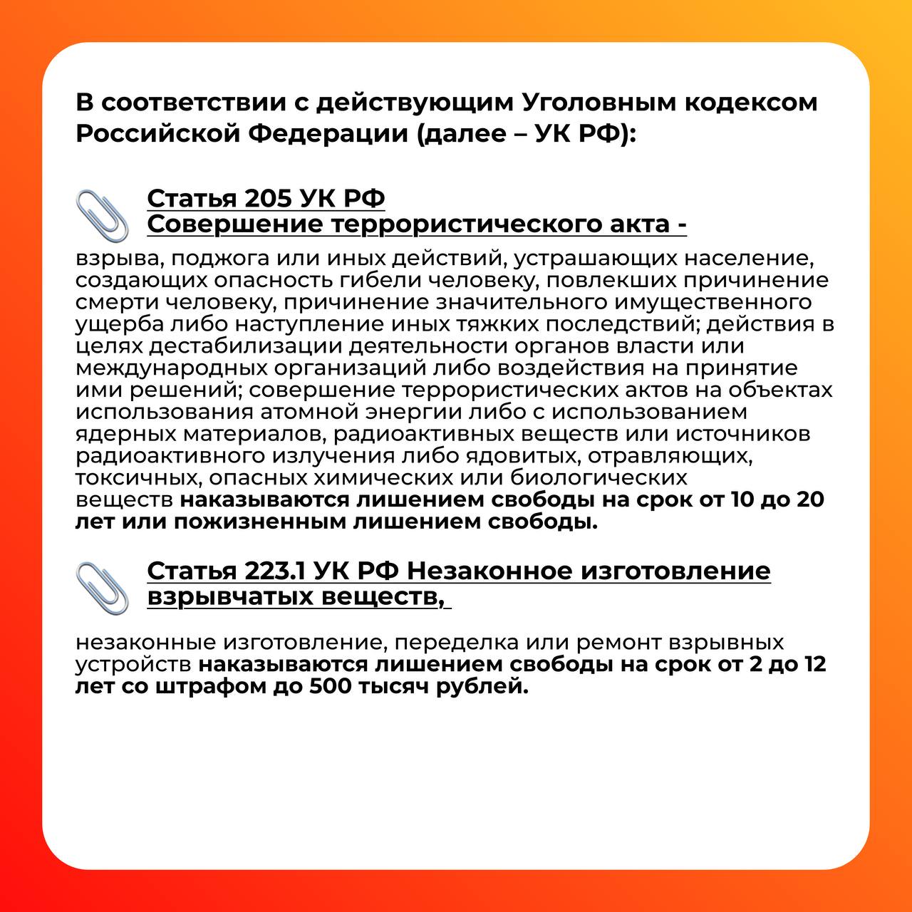 __________________________________________________________________________________________________________________________ Противодействие экстремизму и идеологии терроризма![]() Экстремизм и терроризм сегодня — одни из наиболее опасных явлений жизни, которые нарушают нормальное функционирование нашего общества и угрожают жизнедеятельности граждан. По своим направлениям экстремизм и терроризм разнообразны. Экстремистская деятельность может осуществляться в отношении совершенно различных субъектов: органов власти, должностных лиц, общественных и религиозных объединений, социального строя или социальных групп, религиозных общин или религиозных деятелей, наций, народностей. Отсюда и разные формы экстремизма. Поэтому тебе, уважаемый студент, необходимо знать, чем могут быть опасны призывы тех или иных граждан о вступлении в неформальное движение под лозунгами борьбы молодежи с каким-либо явлением. Важно отличать понятие «патриотизм» от идей, которые навязывают лица с явно выраженной агрессией. Необходимо соблюдать толерантное поведение и быть терпимым к лицам другой веры, национальности и политических взглядов. Нормативная база⇒ Федеральный закон "О противодействии терроризму" от 06.03.2006 N 35-ФЗ (последняя редакция) ⇒ Концепция противодействия терроризму в Российской Федерации Профилактика экстремизма и терроризмаПриказы ► Приказ О создании кибердружины Инструкции ► Инструкция по обеспечению комплексной безопасности, правопорядка и антитеррористической защищенности ► Краткая инструкция обучающихся на случай вооруженного нападения Памятки ► Памятка «Если вы оказались в заложниках у преступников» ► Как сообщить о противоправном контенте ► Как понять, что подросток подвергся вербовке в националистическую экстремистскую группировку Полезные ссылки КонтактыМЧС России МВД России Управление ФСБ России по Алтайскому краю Краевой социально-реабилитационный центр для несовершеннолетних "Солнышко" Алтайский краевой психоневрологический диспансер для детей Алтайский краевой кризисный центр для мужчин Алтайский краевой кризисный центр для женщин Уполномоченный по правам ребенка в Алтайском крае Алтайский краевой центр ППМС-помощи Телефонная линия «Ребенок в опасности» Петерс Галина Ивановна, директор КГБПОУ «Славгородский педагогический колледж» Агалакова Вера Вячеславовна, заместитель директора по воспитательной работе Хохлов Алексей Владимирович, преподаватель-организатор ОБЖ Адрес: 658820, Алтайский край, г. Славгород, ул. Луначарского, 146 Телефон доверия для детей, подростков и их родителей Мероприятия по противодействию экстремизму и идеологии терроризмаУчебные тренировки по антитеррористической защищенности► Видеоотчёт от 11 09 2023 (учебный корпус №3)