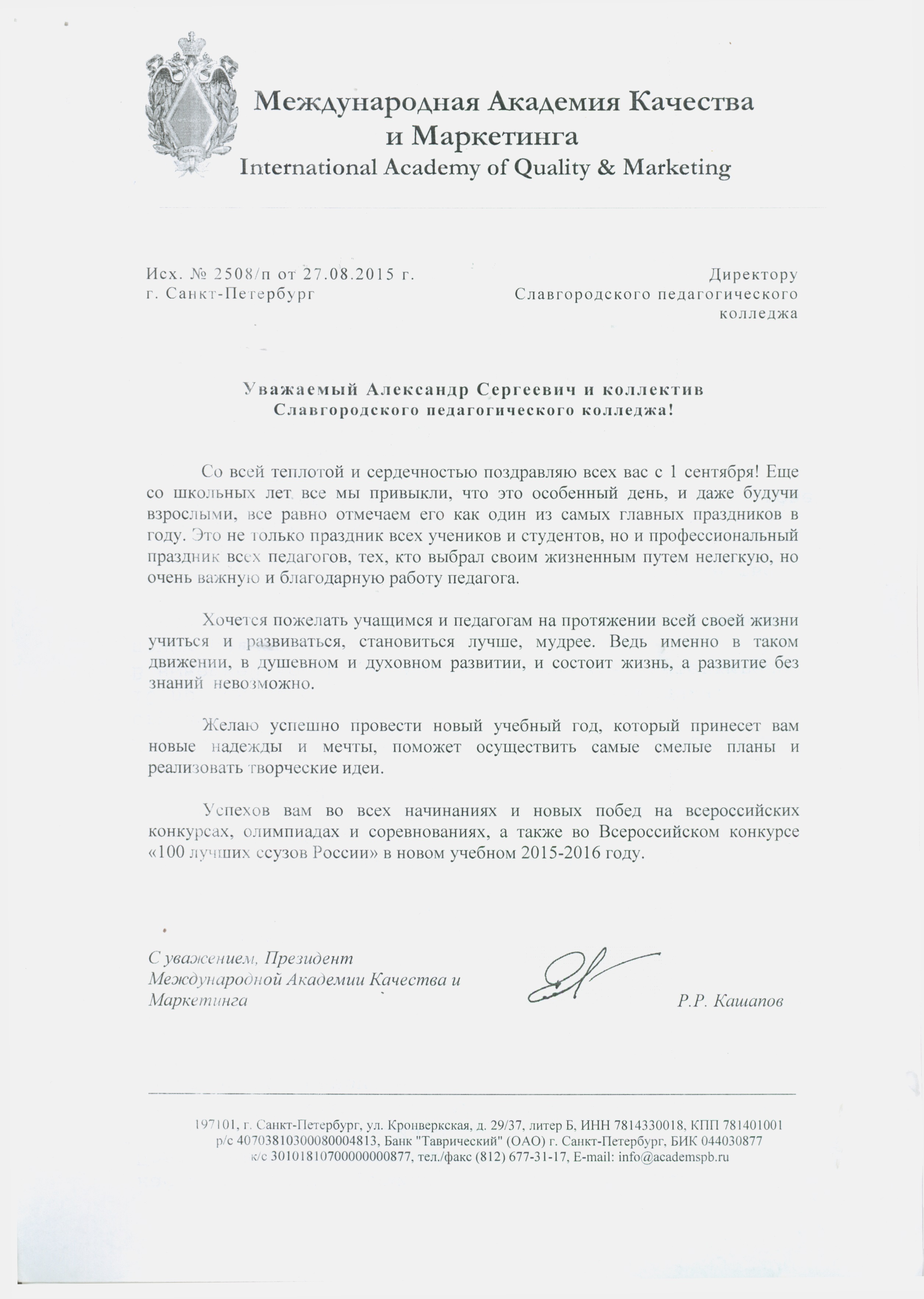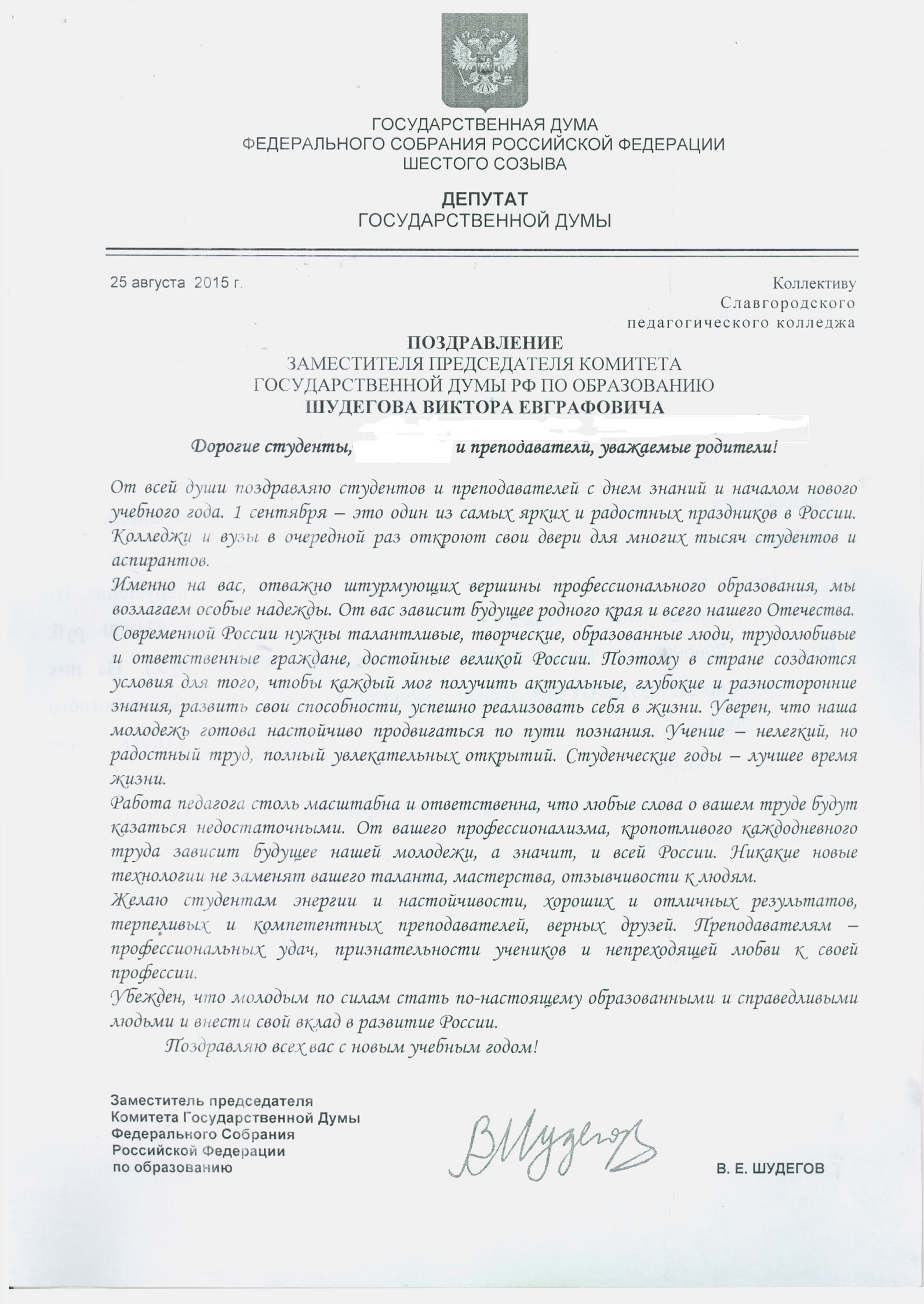 01.09.15 01.09.15 ПОЗДРАВЛЕНИЕ ЗАМЕСТИТЕЛЯ ПРЕДСЕДАТЕЛЯ КОМИТЕТА ГОСУДАРСТВЕННОЙ ДУМЫ РФ ПО ОБРАЗОВАНИЮ ШУДЕГОВА В.Е. 31.08.15 Осталось чуть больше года до 90 -летия Славгородского педагогического колледжа.У его выпускников есть добрая традиция далее...