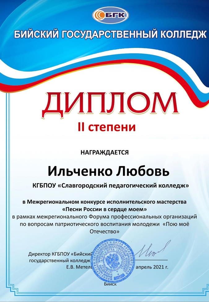 Диплом 2 степени в межрегиональном конкурсе исполнительского мастерства «Песни России в сердце моем»
