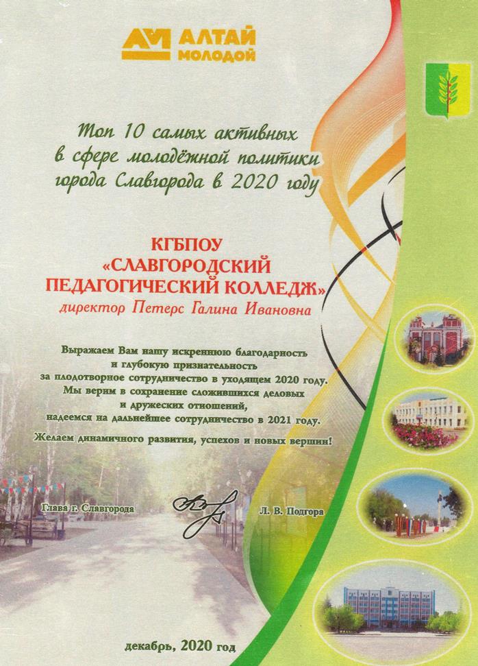 Колледж вошел в Топ - 10 самых активных городских учреждений и организаций в сфере молодежной политики Славгорода