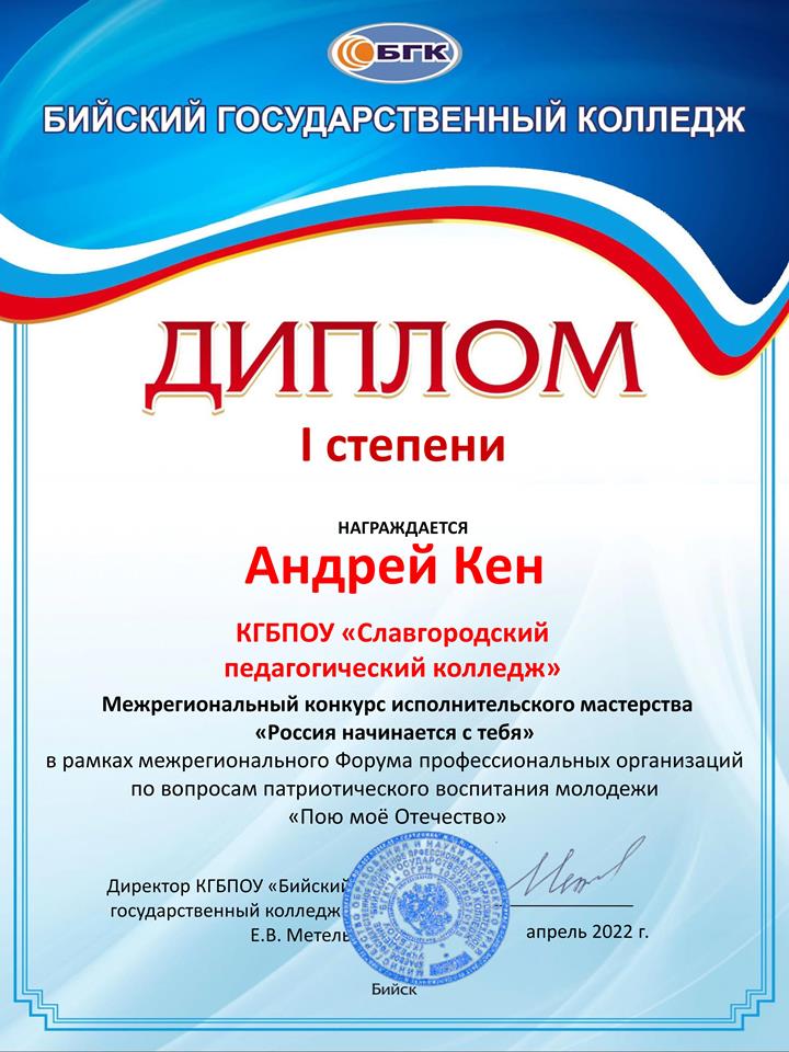 Диплом 1 степени в межрегиональном конкурсе исполнительского мастерства «Россия начинается с тебя»