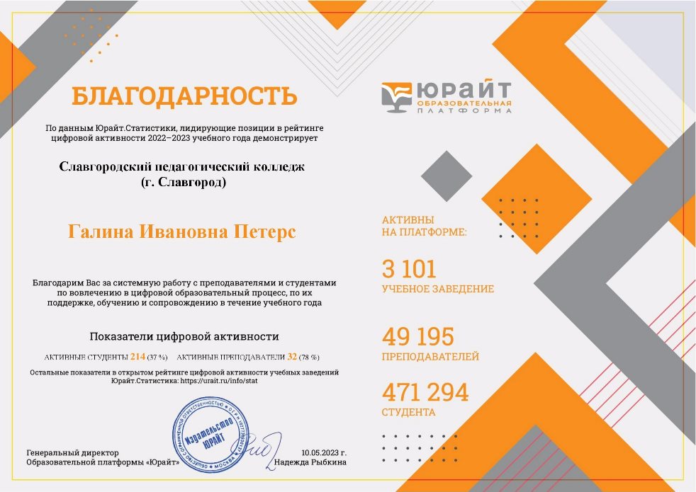 Волонтерские отряды «ИГРОВЕСТ» и «ФИНСОВЕТ» получили благодарность от Комитета по культуре и молодежной политике Администрации муниципального округа город Славгород