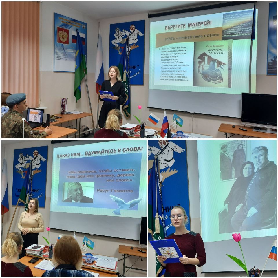 ![]() День Матери В общежитии студентами были проведены мероприятия, направленные на улучшение семейных отношений, воспитания заботы, уважения и желание сделать приятное маме самому дорогому человеку! Свои добрые чувства студенты вложили в подарки, сделанные ими к празднику, провели традиционную акцию «Звонок маме», подготовили поздравление мамам – работницам общежития, оформив праздничный уголок – поздравление. В рамках Года Расула Гамзатова студенты нашего Клуба провели совместное мероприятие с курсантами ВПК «Десантник», посвящённое Дню Матери. Ребята узнали, как трепетно относился поэт к своей маме. Тема материнства наиболее ярко начинает проявляться, выделяясь в отдельное направление, после смерти матери Р.Гамзатова. В его поэзии образ матери всегда сердечен, нежен, трогателен. Поэт осознавал, что мама – начало всех начал, неиссякаемый источник нежности, добра, всепонимания и всепрощения. Нельзя не согласиться со словами великого поэта, что мать – опора земли, её жизнелюбием, милосердием и бескорыстием создается, крепнет и умножается род людской. Для подтверждения своих мыслей он обращается к традициям Северного Кавказа, отражающих ценность и значимость матери как в личной жизни отдельного человека, так и в обществе в целом: «Горцы говорят: лишённый отца – полусирота, а лишённый матери – сирота полный». В народе есть присловье: отцов могут заменить, но матерей не заменяют. Без матери потухает очаг, рушится дом. Нет лучше и пронзительней песен, чем песни матерей, и не напрасно, наверное, утверждают набожные люди, что молитвы матерей доходят до слуха и сердца Всевышнего». Самая обязательная клятва - клятва матерью, самое унизительное оскорбление – бранное слово о матери. Мама - единственная как земля, вода, небо и потому свята. В поведении людей немало негативных проявлений, но самое аморальное из них – матерщина. В Дагестане раньше это никому не прощалось. За осквернение и оскорбление матерей наказывали кинжалом и пулей. Наоборот, платки матерей, брошенные под ноги разъярившимся врагам, отвращали кровопролитие… «Писать о матерях буду, покуда «не оборвётся жизни непрочная нить». И это не считаю личной заслугой, ибо это – долг человеческий, благодарное сыновнее чувство». Мать – вечная тема поэзии. Невозможно даже представить, сколько прекрасных слов сказано об этом! Но Р.Гамзатов нашёл необыкновенные, новые, слова. Он не побоялся повторяться в выборе темы. И оказалось, что его гимн матери зазвучал в общем резонансе мировой лирики! «По-русски «мама», Расул Гамзатов говорил о маме: «Все мамы относятся к одной нации, к одной любви». «Мама», «Матери», «Не оставляйте матерей одних», «Слово о матери», поэма «Берегите матерей», - в этих произведениях он настолько трогательно изобразил своё отношение к матери, что при прочтении его стихотворений на глаза наворачиваются слёзы… В исполнении Виктории Акимовой, Александра Белана, Елизаветы Паршиной, О.А. Стрельниковой прозвучали стихи Расула Гамзатова о маме. Виктория Руденко исполнила песню о маме. Прочувствовав строки о матери «… Встаньте! Я произношу его «Мама», - все присутствующие на мероприятии встали… Обращаясь ко всем детям, у кого матери ещё живы, поэт говорит: «Если стали сердцем вы суровы. Закончилось мероприятие чаепитием и обменом впечатлений. Все получили большо
