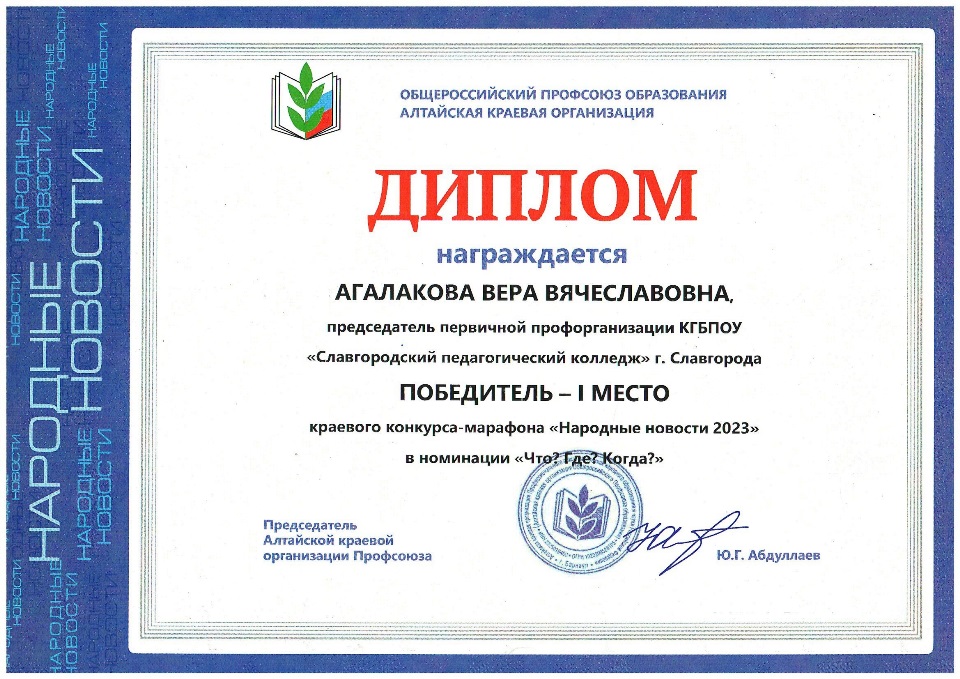 ![]() Наши профсоюзные новости – лучшие в крае! Первичная профсоюзная организация КГБПОУ «Славгородский педагогический колледж» под руководством председателя Агалаковой В.В. заняла 1 место в краевом конкурсе – марафоне «Народные новости – 2023» в номинации «Что? Где? Когда?». Марафон проводился с января по ноябрь 2023 года с целью повышения интереса к освещению профсоюзной тематики в газетах «Мой Профсоюз» и «Профсоюзы Алтая», на сайтах и группах Профсоюза в социальных сетях, формирования сети внештатных профсоюзных корреспондентов, повышения общественной значимости работы, проводимой профсоюзными организациями, а также усиления мотивации профсоюзного членства, обобщение опыта работы профлидеров. Участие в Марафоне принимали профсоюзные активисты, члены молодежных советов, ветераны профсоюзного движения, педагоги всех уровней образования – члены Профсоюза, обучающиеся организаций высшего образования, а также профессиональные журналисты Алтайского края. Поздравляем первичную организацию нашего колледжа с победой и желаем еще много хороших новостей! Автор: В.В.Агалакова, председатель первичной профсоюзной организации СПК Фото предоставлено автором