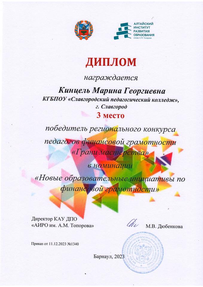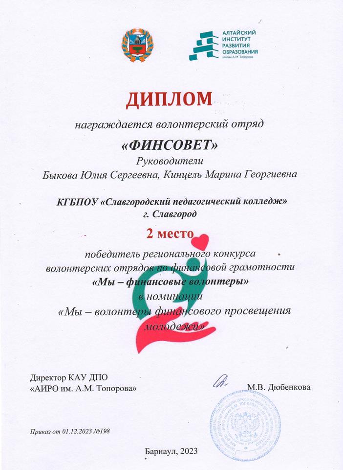 ![]() Достижения в финансовом просвещении школьников и студентов Во второй половине декабря были подведены итоги региональных конкурсов по финансовому просвещению. Конкурсы прошли в рамках реализации государственной региональной программы «Повышение уровня финансовой грамотности населения в Алтайском крае». По результатам конкурса волонтерских отрядов по финансовой грамотности «Мы - финансовые волонтеры» наш отряд «ФИНСОВЕТ» (руководитель Быкова Ю.С., наставник Кинцель М.Г.) в номинации «Мы - волонтеры финансового просвещения молодежи» занял II место. Конкурс был направлен на развитие волонтерского движения по финансовой грамотности среди школьников и студентов. На участие в конкурсе в этом году подали заявки 25 волонтерских отрядов. За первое и второе места команды были награждены дипломами и планшетами, все победители и призеры получили настольные финансовые игры, разработанные сотрудниками АИРО. В это же время были подведены итоги четвертого регионального профессионального конкурса для педагогов финансовой грамотности «Грани мастерства». Он направлен на выявление лучших практик профессиональной деятельности педагогов Алтайского края в области формирования финансовой грамотности различных категорий граждан, на участие в конкурсе было подано более 70 заявок. Кинцель М.Г. получила Диплом III степени в номинации «Новые образовательные инициативы по финансовой грамотности» и новогодний подарок - умную колонку от Яндекс «Станция Лайт». Организатором конкурсов является Министерство образования и науки Алтайского края совместно с КАУ ДПО «АИРО имени А.М. Топорова» при поддержке Министерства финансов Алтайского края. Автор: Кинцель М.Г., заместитель директора колледжа Логотип из открытых источников, скан-копии дипломов предоставлены автором