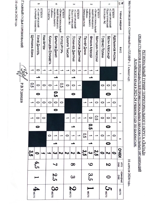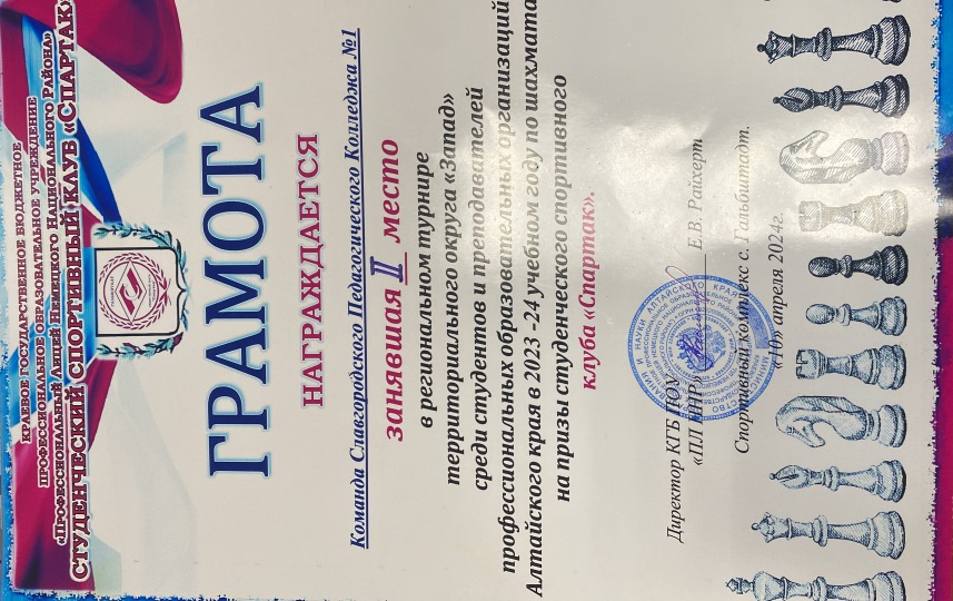 ![]() Региональный турнир по шахматам 10 апреля в Профессиональном лицее Немецкого Национального района прошел Региональный турнир территориального округа «Запад» по шахматам. Наш колледж представляли две команды: СПК-1 Лохмачев Дмитрий (42), Прохоров Дмитрий (32), Сахарук Таисия (16); СПК-2 Адельханов Руслан (22), Белан Александр (12), Голенко Полина (11). В результате напряженных игр, команда СПК-1 заняли почетное 2-е место. Хотелось бы отметить, что Прохоров Дмитрий не проиграл ни одной встреч! Поздравляем команды колледжа и желаем всем дальнейших спортивных побед! Автор: К.С. Колегова, руководитель ССК «Олимп» Фото предоставлены автором