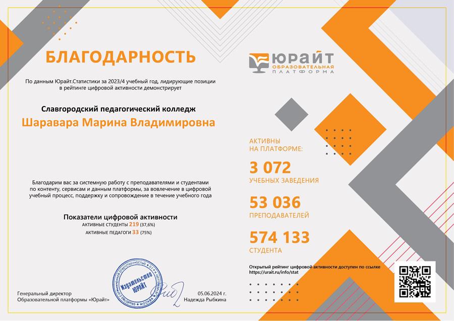 ![]() Славгородский педагогический колледж подтверждает качество образования: «Юрайт» на протяжении 4 лет сравнивает цифровую активность образовательных организаций России по различным показателям использования платформы в учебном процессе. Рейтинг цифровой активности представлен в открытом виде на платформе. Славгородский педагогический колледж занимает высокие позиции в Национальном рейтинге цифровой активности студентов и преподавателей – 2024: В рейтинге указаны наиболее активные преподаватели и студенты организации. Большой вклад в развитие цифровой активности вносит Шаравара Марина Владимировна, в чьи обязанности входит координация пользователей на платформе. Методика исследования При составлении рейтинга были учтены 3 ключевые характеристики цифрового обучения: Контент: работа пользователей с 6300+ курсами и 10900+ учебниками платформы, образовательными медиаматериалами и дополнительной литературой (напомним, что у пользователей организации есть доступ к материалам платформы). Сервисы: проведение и прохождение различных форм интерактивного оценивания: входное тестирование, адаптивное формирующее тестирование, задания, экзамены, участие в акциях Тотальный экзамен (независимая оценка качества образования) и Конституционный экзамен (воспитательная деятельность), взаимодействие преподавателей и студентов. Данные: методика предполагает объективность цифровых следов, оставляемых пользователями. Подробнее о цифровой активности и методиках ее развития речь пойдет на XV Летней школе преподавателя – ведущей онлайн-конференции по российской цифровой педагогике. Краткий вывод Высокие позиции в рейтинге свидетельствуют о значительном инновационном потенциале учебного заведения в современной экономике, основанной на человеческом капитале и непрерывном образовании. Выпускники за годы обучения овладевают не только профессиональными навыками, но также получают широкие цифровые компетенции, позволяющие реализовать себя на рынке труда, добиться профессионального и личностного роста. Сейчас, в период приемной кампании, абитуриенты могут выбрать образовательную траекторию с учетом широких цифровых возможностей учебного заведения. Исследовательская команда «Юрайт.Статистика» продолжает работу по диагностированию цифровых процессов в российском образовании и готовит новые аналитические данные к сведению администраторов образования, представителей академической среды и широкой общественности. Мы рассматриваем высокий результат организации как сочетание объективно высокого уровня цифрового образования и успеха стратегического управления процессом цифровой трансформации. Для нас большая честь – развивать партнерские отношения с цифровыми лидерами образования. Автор: Екатерина Пучнина, Логотип из открытых источников