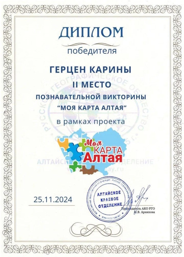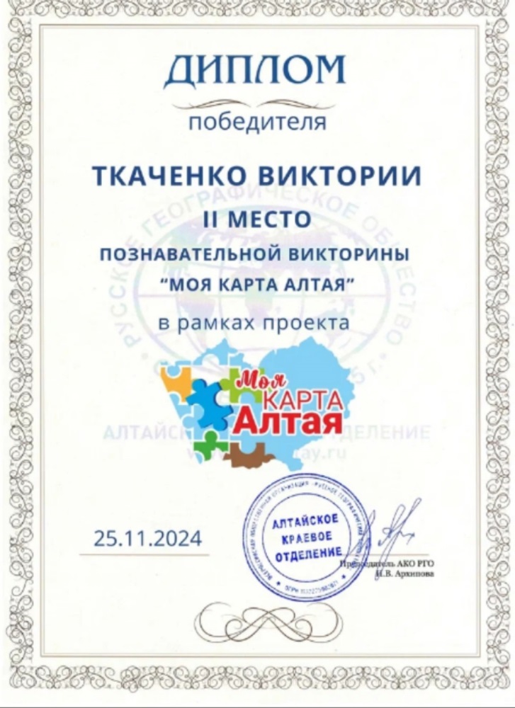 ![]() Студенты колледжа победители краевой познавательной викторины «Моя карта Алтая» - новый масштабный проект Алтайского краевого отделения Русского географического общества, который состоит из просветительских и образовательных мероприятий для школьников 4-11 классов городов и сел Алтайского края. Проект оказывает методическую и картографическую поддержку педагогам учебных заведений Алтайского края. Цель проекта: создание условий для развития географических представлений о своей Родине и практическом значении картографии в изучении своего региона для школьников 4-11 классов и их педагогов, а также вовлечение в исследовательскую деятельность путем организации образовательных и научно-популярных мероприятий и практик. Организация проекта касалась многих вопросов: были подготовлены необходимые картографические материалы, приобретены спилс-карты Алтайского края и России, издана методическая литература, проведены многочисленные мероприятия и встречи в районах края. Итоги своей учебы ребята продемонстрировали на финальном мероприятии по номинациям: исследовательская работа, рисунки, сборка спилс-карт и викторина. Почти две тысячи участников из 124 образовательных организаций, 42-х городов и районов Алтайского края приняли участие в викторине, которая проводилась в рамках проекта «Моя карта Алтая». Самыми активными участниками викторины стали ребята из Барнаула, Заринска, Бийска, Славгорода, Бийского, Павловского, Поспелихинского и Советского районов. Студенты и преподаватели нашего колледжа приняли участие в познавательной викторине «Моя карта Алтая». Герцен Карина и Ткаченко Виктория, студентки 15 группы, стали победителями викторины, награждены Дипломами за 2 место. Поздравляем Карину и Викторию с победой, желаем успехов и новых достижений! Любовь к родной земле дает нравственное и патриотическое воспитание молодежи. Тот, кто хорошо знает и любит свой край, всегда будет защищать его природу, будет стараться внести свою лепту в охрану той территории на который он живет. Карта края должна быть в каждом доме, в каждой семье, и каждый должен знать и уметь по ней ориентироваться. Приглашаем всех, кто желает найти ответы на вопросы викторины прочитать научно-популярное издание «Исследователи и путешественники на карте Алтая», подготовленную в рамках проекта. Автор: Н.А. Булгакова, преподаватель географии Логотип из открытых источников