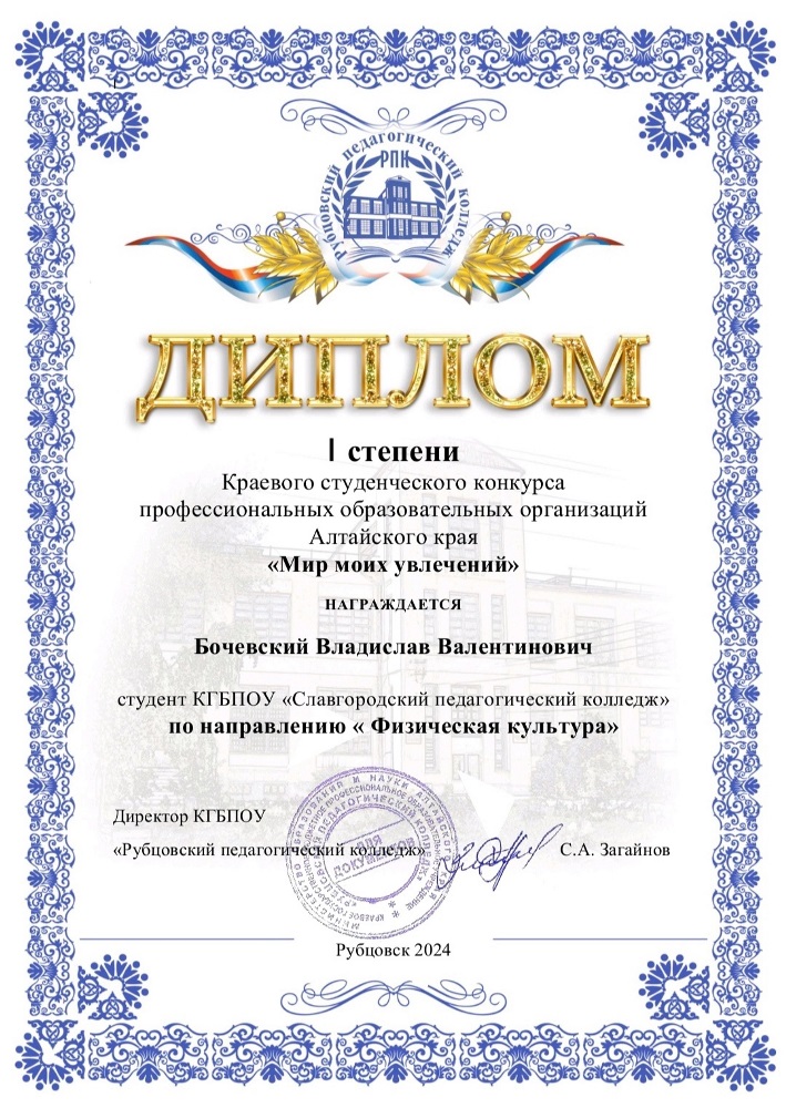![]() Итоги краевого конкурса «Мир моих увлечений» Студенты Славгородского педагогического колледжа приняли участие в краевом конкурсе «Мир моих увлечений», который прошел на базе Рубцовского педагогического колледжа по решению Совета директоров профессиональных образовательных организаций Алтайского края. Задачи конкурса – раскрытие и поддержка творческого потенциала студентов, популяризация позитивных форм досуговой деятельности, развитие социально – коммуникативных компетенций обучающихся и, конечно же, расширение сферы сетевого взаимодействия с социальными партнерами. По итогам конкурса студент 26 группы Славгородского педагогического колледжа Владислав Бочевский под руководством преподавателя физической культуры Е.В.Мороза занял 1 место, а студентка 31 группы Карина Клокова (руководитель – куратор группы О.В. Серебрянская) награждена Дипломом 3 степени. Работа Владислава посвящена его увлечению баскетболом, а Карина рассказала о своих занятиях танцами. Работы получились не только содержательными, яркими и эмоциональными – жюри отметило социальную значимость, а также оригинальность формы представления увлечений наших студентов. Автор: В.В. Агалакова, заместитель директора колледжа Фото предоставлены автором