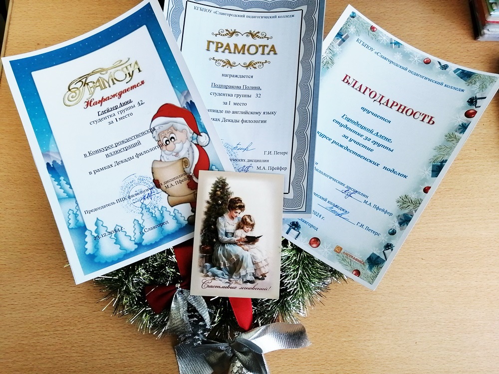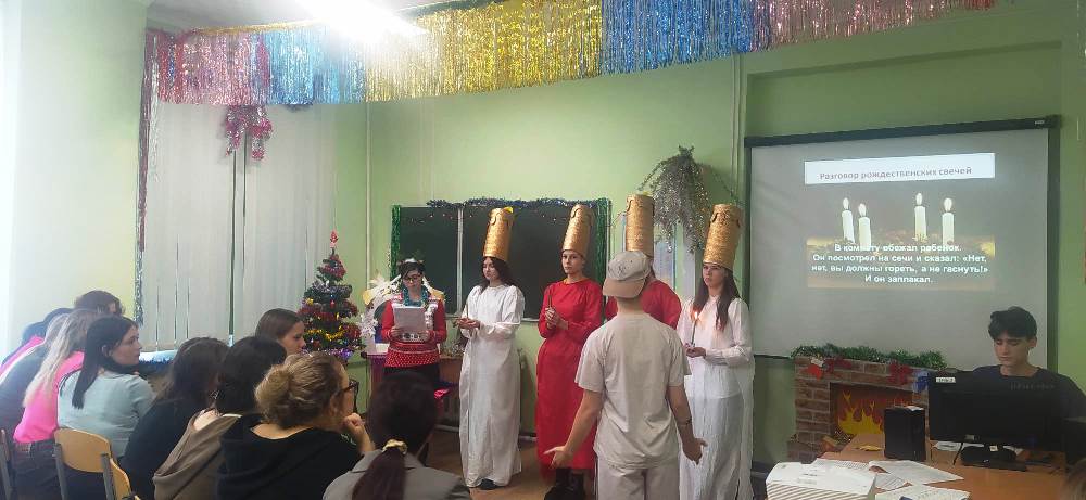 ![]() Итоги Декады филологии – 2024 в колледже 23 декабря 2024 г. в колледже состоялось традиционное мероприятие «Рождественские встречи», на которое студенты 21 гр. (куратор Т.С. Хобенкова) пригласили первокурсников, чтобы напомнить об истории Рождества, его символах и традициях в России и в странах изучаемого языка. Зрители сразу погрузились в атмосферу праздника благодаря рождественским декорациям, нарядно украшенной елке и литературно-музыкальному представлению, в котором нашлось место и проникновенному повествованию о библейском сюжете, и коротким сценкам, и артистичному исполнению стихов и песен на русском, немецком и английском языках. Зрители приняли участие в рождественской викторине. Эта встреча послужила своеобразным подведением итогов Декады филологических дисциплин, девизом которой в этом году стали слова «Культура начинается в семье». Все мероприятия Декады были направлены на создание условий для повышения мотивации к изучению родного (русского) языка и русской литературы, а также иностранных языков, и демонстрацию интеллектуальных и творческих достижений обучающихся. Нет сомнений в том, что именно в семье закладывается фундамент наших духовно-культурных ценностей, осознания гордости за достижения национальных традиций и культуры и стремления к знакомству с лучшими образцами мировой культуры. Неслучайно первым в ряду мероприятий Декады стало проведение внутриколледжного этапа Всероссийского конкурса сочинений «Без срока давности», который был организован преподавателем русского языка и литературы Танаевой Т.В., а также советником директора по воспитанию Кеном А.С. Студенты групп нового набора познакомились с условиями проведения конкурса, направленного на воспитание патриотизма у молодого поколения, увековечение памяти о героических и трагических событиях Великой Отечественной войны. На данный момент многие студенты, не только первокурсники, приступили к работе по написанию сочинений. Лучшие работы на уровне колледжа будет отобраны в начале января. В воспитательной ценности русской литературы и необходимости широкого литературного кругозора для будущего педагога смогли убедиться студенты 1 курса, ставшие участниками и зрителями литературной викторины «Самые ценные страницы – вместе с близкими». Формат викторины, разработанной Танаевой Т.В., был представлен в виде старинной книги, листая которую, студенты выполняли интересные задания. Разгадывание портретов писателей, изображенных нейросетью, вызвало особый интерес у участников. Хочется отметить не только эрудицию участников, но и большую поддержку зрителей, представивших убедительную рекламу такого интеллектуального занятия, как чтение художественной литературы. Традиционными мероприятиями Декады являются предметные олимпиады и страноведческая викторина. Участие в олимпиадах по русскому языку и литературе, по английскому и немецкому языкам потребовало от студентов не только отличных знаний программного материала, но и лингвистической эрудиции более высокого уровня, что помогло выявить потенциальных участников для подготовки к предметным олимпиадам краевого уровня, в которых студенты нашего колледжа традиционно демонстрируют отличные результаты. Всем второкурсникам была предложена викторина на русском языке «Культура, я