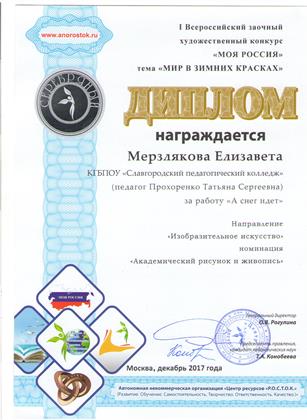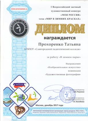 В этот раз, участвуя в творческом конкурсе «Моя Россия» тема «Мир в зимних красках», мы поднялись на ступень выше и отмечены Серебряными дипломами. За творческие работы: рисунок - «А снег идет», фотографию – «В зимнем парке» награждены Мерзлякова Елизавета, студентка 42 группы и преподаватель колледжа Прохоренко Татьяна Сергеевна. Работы оценивались по критериям: оригинальность замысла и его соответствие задачам и теме конкурса, уровень художественного мастерства авторов. Мы поздравляем призеров всероссийского конкурса.