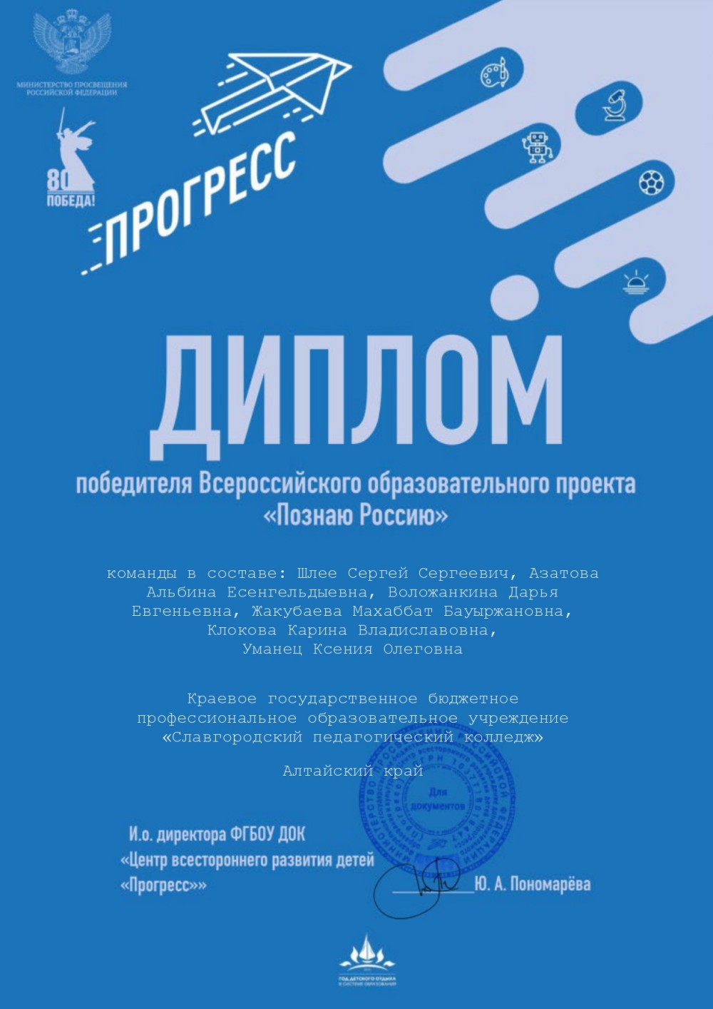 ![]() «Познаю Россию»: итоги масштабного образовательного проекта 4 ноября 2024 года, в День народного единства, стартовал Всероссийский образовательный проект «Познаю Россию». Цель проекта: вовлечение обучающихся образовательных организаций в туристско-краеведческую деятельность, а также научно-образовательный туризм, направленный на популяризацию культурного, исторического, природного наследия Российской Федерации, знакомства с историческим прошлым, героическими страницами истории России, судьбами выдающихся людей. Проект был реализован в заочном формате с ноября 2024 года по май 2025 года и включал в себя 7 уроков, которые публиковались ежемесячно. Каждый урок состоял из информационного интерактивного познавательного эфира (видео) и викторины, состоящей из 20 вопросов. Каждый вопрос викторины оценивался в 1 балл. Максимально команда могла набрать за урок - 20 баллов. К участию в проекте допускались команды в составе от 5 до 30 человек, сформированные из обучающихся образовательных организаций и студентов профессиональных образовательных организаций. Проект объединил 18579 участников образовательных организаций, 1915 команд. Проект входит в перечень мероприятий, рекомендуемых к реализации в рамках календарного плана воспитательной работы на 2024/2025 учебный год Минпросвещения России. Команда студентов 31 группы «Туристы-краеведы СПК», состоящая из шести человек: Шлее Сергея, Азатовой Альбины, Воложанкиной Дарьи, Жакубаевой Махаббат, Клоковой Карины и Уманец Ксении, принимала участие во Всероссийском проекте «Познаю Россию». Ребята проделали огромную командную работу под руководством Н.А. Булгаковой, преподавателя естественно-научных дисциплин. В рамках проекта ребята познакомились с заповедниками России, российскими архитектурными и природными объектами всемирного наследия ЮНЕСКО, мемориальными комплексами Российской Федерации, посвящённых Великой Отечественной войне, городами-героями России и полководцами Великой Отечественной войны, кавалерами ордена «Победа». По итогам семи испытаний команда «Туристы-краеведы СПК» набрала 137 баллов из 140 возможных. 30 мая завершился Всероссийский образовательный проект «Познаю Россию», подведены итоги. Наша команда стала победителем и награждена Дипломом победителя! Полученные знания и опыт станут бесценным вкладом в их будущей профессии. Молодцы, ребята! Поздравляем с победой и желаем дальнейших успехов в изучении нашей страны!