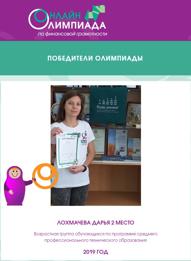 ![]() Студентка второго курса школьного отделения вошла в число победителей Всероссийской олимпиады по финансовой грамотностиВсероссийская онлайн-олимпиада по финансовой грамотности для учащихся 5-11-х классов и студентов среднего профессионального образования проводилась в рамках реализации совместного Проекта Российской Федерации и Международного банка реконструкции и развития «Содействие повышению уровня финансовой грамотности населения и развитию финансового образования в Российской Федерации» по заказу Министерства финансов Российской Федерации. Для каждой возрастной группы участников был разработан свой набор заданий. Олимпиада проводилась в 2 тура в заочной форме. Отборочный тур с 16 по 30 сентября 2019 года, заключительный тур с 07 по 21 октября 2019 года. Отвечать на вопросы Олимпиады можно было в один из дней проведения туров. Участнику давалось 3 часа без перерыва на все ответы в режиме онлайн. Задания Олимпиады были тесно связаны с современными вопросами и проблемами финансовой грамотности и мотивировали участников Олимпиады на поиск дополнительных материалов. Ключевые понятия, явления, объекты заданий охватывали широкую область финансовой грамотности. Основные тематические блоки Олимпиады: Семейный бюджет; Деньги; Банки; Налоги; Валюта; Фондовый рынок; Бизнес; Семья и государство; Страхование; Пенсионные накопления; Финансовые риски. В двух турах олимпиады от колледжа участвовала студентка 21 группы Дарья Лохмачева и заняла второе место (руководитель Кинцель М.Г. – преподаватель основ финансовой грамотности). Организаторы Олимпиады опубликовали ее фото на сайте мероприятия. В декабре 2019г. под руководством преподавателя социально-экономических дисциплин Серебрянской О.В. в колледже создан волонтерский отряд по финансовой грамотности, Даша в числе первых записалась в этот отряд. Администрация колледжа поздравляет Дарью с успешным участием во Всероссийской олимпиаде и желает успехов ей и ее одногруппникам в волонтерской деятельности.
