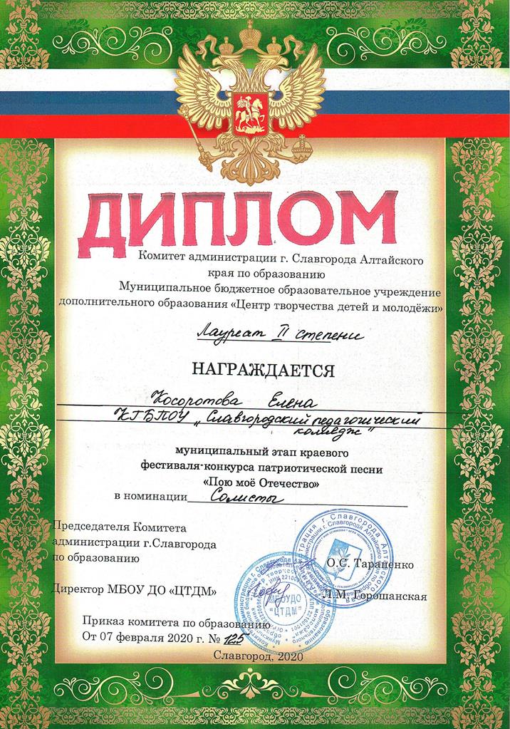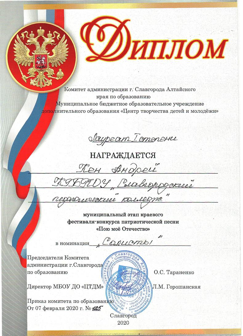 ![]() Победа в городском конкурсеГородской этап фестиваля – конкурса патриотической песни «Пою мое Отечество» прошел 7 февраля 2020 года в ЦТДМ г. Славгорода. На суд жюри конкурса, главной целью которого является духовно нравственное и патриотическое воспитание детей и молодежи средствами музыкального искусства, были представлены вокальные номера от образовательных организаций нашего города. Славгородский педагогический колледж в этот день представляли 3 конкурсанта: студентка 11 группы Елена Косоротова, студентка 21 группы Любовь Ильченко и студент 21 группы Андрей Кен. От всей души поздравляем наших вокалистов с успешным выступлением: по итогам конкурса Лауреатом 1 степени стал Андрей Кен, Лауреатом 2 степени – Елена Косоротова, а Дипломом Лауреата 3 степени награждена Любовь Ильченко.