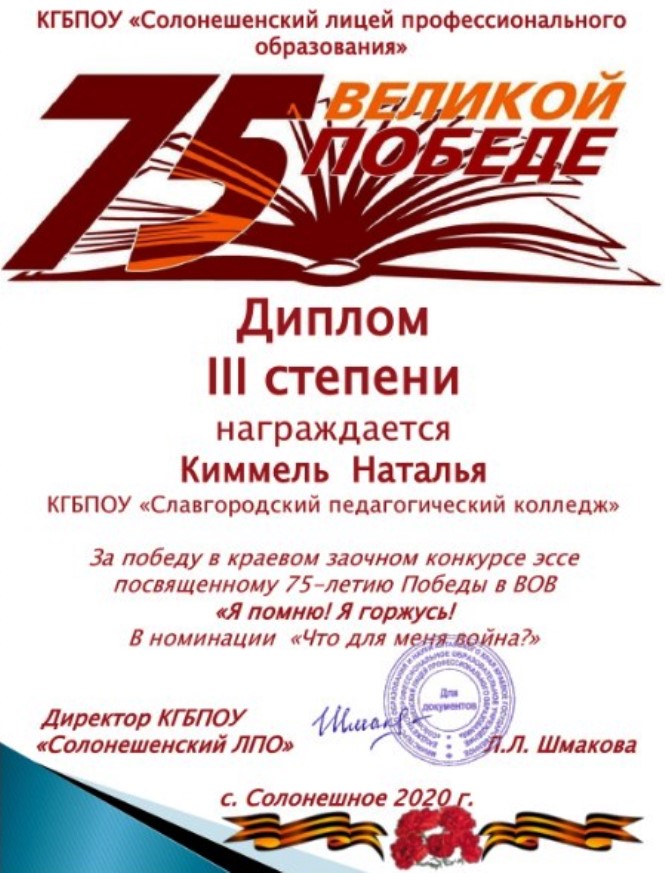 Хочется отметить, что студенты и преподаватели колледжа приняли активное участие в краевых конкурсах «Наша общая Победа», «Хочешь мира? Помни о войне» и других; с 8 мая начинают подводиться итоги этих конкурсов, и уже стало известно, что студентка 12 группы Наталья Киммель заняла 3 место в краевом заочном конкурсе эссе «Я помню! Я горжусь!»