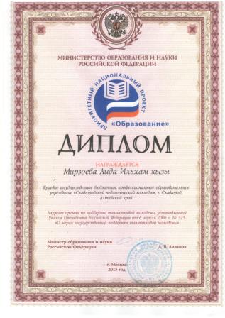 В середине февраля в г. Барнауле, в большом зале администрации Алтайского края состоялась торжественная церемония чествования лауреатов премии президента Российской Федерации в рамках проекта «Образование». Всего было награждено 73 человека, из которых 54 являлись победителями региональных и призерами всероссийских конкурсных мероприятий. Среди награжденных была наша выпускница 2015 года Аида Мирзоева. В прошлом году она стала победителем студенческой олимпиады по информатике среди средних профессиональных учреждений Алтайского края. Именно это конкурсное мероприятие вошло в список интеллектуальных соревнований, победители которого награждаются премией президента по поддержке талантливой молодежи и Дипломом Министерства образования и науки России. Подготовила конкурсантку к победе в олимпиаде преподаватель информатики и математики нашего колледжа, Куличенко Валентина Геннадьевна.