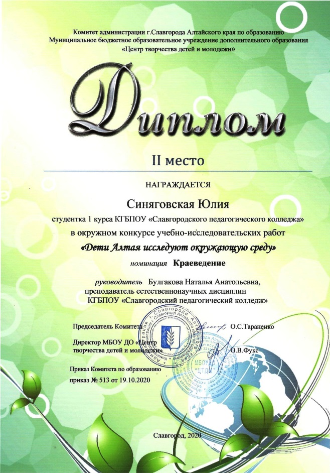 ![]() Дети Алтая исследуют окружающую среду 16 октября 2020 года на базе МБОУ ДО «Центр творчества детей и молодежи» г.Славгорода проведён дистанционно окружной этап краевого конкурса учебно-исследовательских работ «Дети Алтая исследуют окружающую среду». В конкурсе приняли участие 25 обучающихся 12 – 18 лет Славгородского образовательного округа из Кулундинского, Родинского, Благовещенского, Немецкого национального районов и г.Славгорода. Синяговская Юлия, студентка 11 группы, приняла участие в этом конкурсе в номинации «Краеведение». Ее работа отмечена дипломом 2 степени.