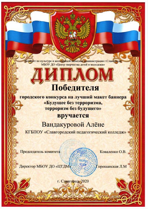![]() Победа в городском конкурсе Студентка Славгородского педагогического колледжа стала победителем городского конкурса на лучший макет баннера «Будущее без терроризма, терроризм без будущего». В конкурсе приняли участие школьники и студенты образовательных учреждений, а также работающая молодежь г. Славгорода. Студенты нашего колледжа приняли активное участие в конкурсе: свои работы на суд жюри представили Наталия Киммель, Алина Торопова, Алена Вандакурова, Юлия Быкова, Карина Тоникян и Татьяна Глущенко. Единогласным решением жюри среди всех представленных работ лучшей была признана работа студентки 13 группы Славгородского педагогического колледжа Алёны Вандакуровой. На основе данного рисунка в ближайшее время будет изготовлен и размещен баннер в городе Славгороде.