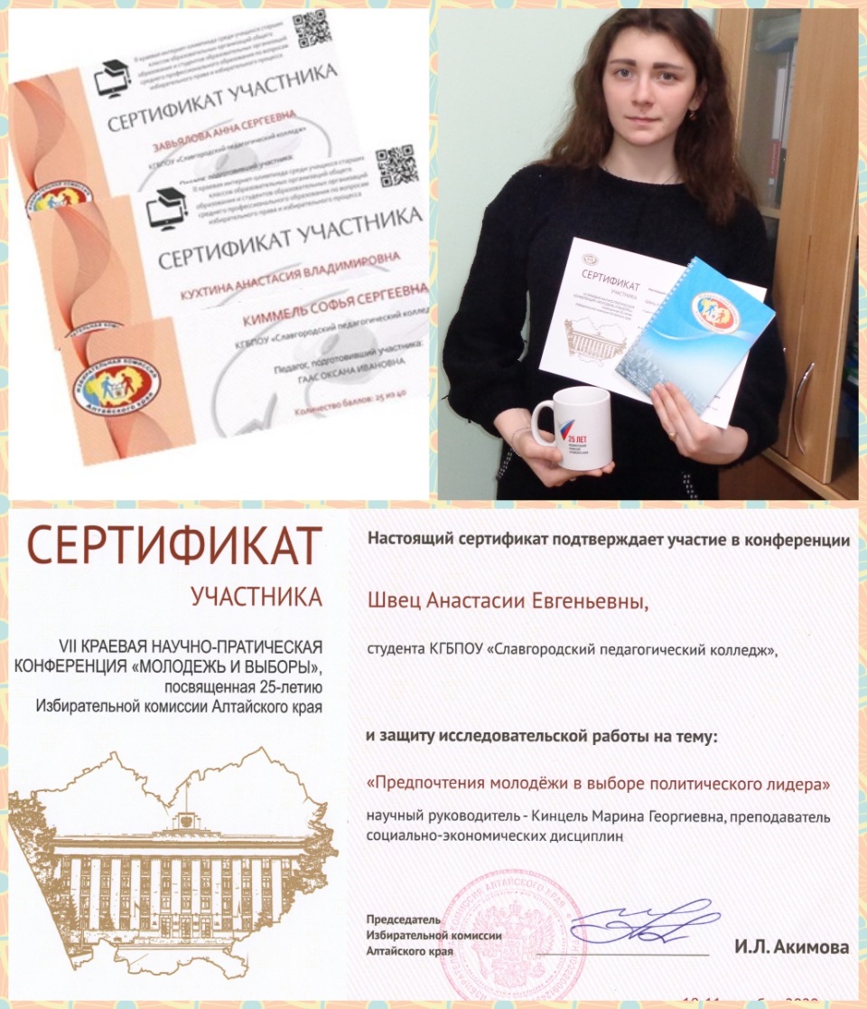 ![]() К 25–летию Избирательной комиссии Алтайского края В 2020 году Избирательной комиссии Алтайского края исполнилось 25 лет. В стороне от этого события не остались студенты Славгородского педагогического колледжа. 16 октября состоялась II краевая интернет-олимпиады среди учащихся старших классов школ и студентов среднего профессионального образования по вопросам избирательного права и избирательного процесса. Олимпиада была организована Избирательной комиссией Алтайского края совместно с Министерством образования и науки Алтайского края. Участие в краевой интернет-олимпиаде приняли 584 человека. Студентки 13 группы школьного отделения Завьялова Анна, Киммель Софья, Кухтина Анастасия. Гаас О.И. – преподаватель, подготовившая участниц олимпиады. 10 – 11 декабря в краевой столице прошла VII краевая научно-практическая конференция «Молодежь и выборы», которая также проводилась Избирательной комиссией Алтайского края совместно с Министерством образования и науки Алтайского края при поддержке Алтайского регионального отделения Общероссийской общественной организации «Ассоциация юристов России», филиала кафедры конституционного и международного права Алтайского государственного университета. В течение двух дней в защите проектов приняли участие 42 человека. Всем участникам Конференции были вручены сертификаты. Научные руководители, под руководством которых осуществлялась подготовка участников мероприятия, отмечены благодарственными письмами. От колледжа участие в конференции приняла студентка 25 группы Швец Анастасия под руководством преподавателя Кинцель М.Г. Кроме этого, Анастасия приняла участие в квест – игре на знание особенностей избирательного права и заняла первое место, за что отмечена памятным подарком с логотипом Избирательной комиссии. В целях профилактики рисков распространения коронавирусной инфекции олимпиада и конференция проходили в on-line формате.