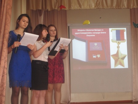 29 марта в актовом зале Славгородского педагогического колледжа прошел открытый классный час, посвященный памяти Героя России, подполковника Олега Анатольевича Пешкова, командира Су-24, предательски сбитого в небе Сирии 24 ноября 2015 года. Классный час подготовили и провели для 1 – 2 курсов студентки 21 группы под руководством куратора Алексея Владимировича Хохлова. На мероприятии присутствовали гости – служащие воинской части г. Славгорода, участники боевых действий в Сирии. В финале гости, студенты и преподаватели колледжа почтили память Олега Анатольевича Минутой молчания.