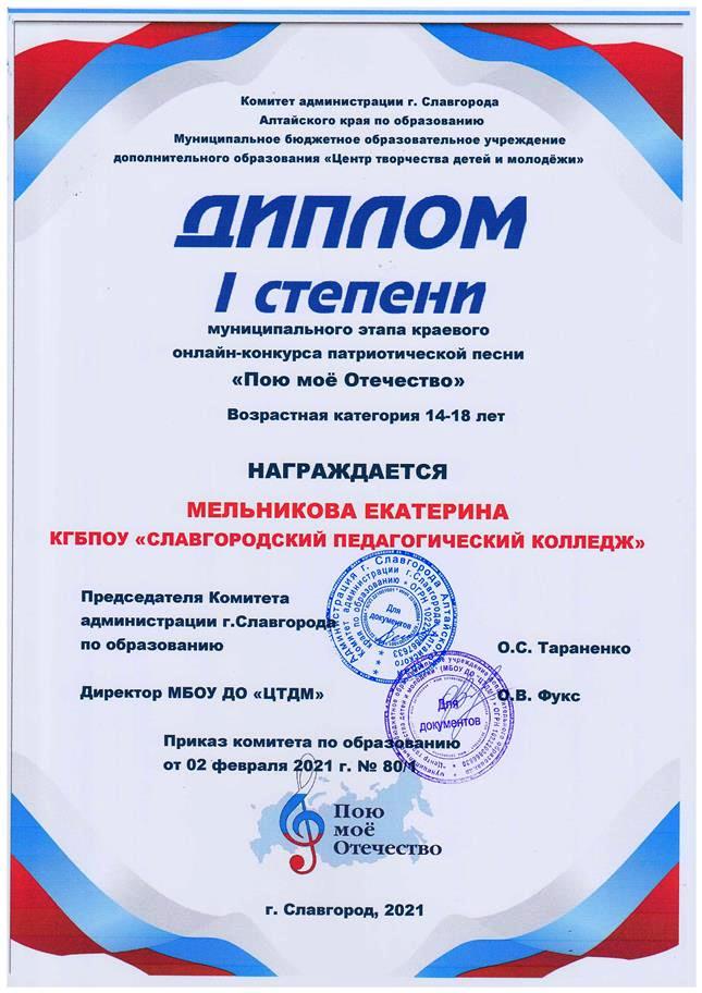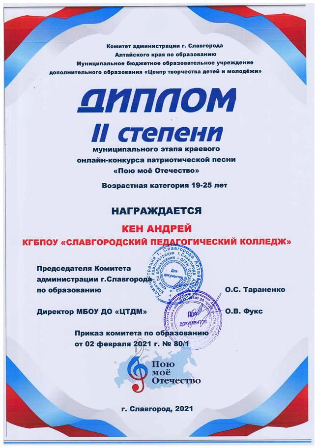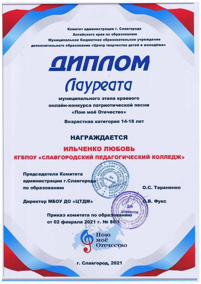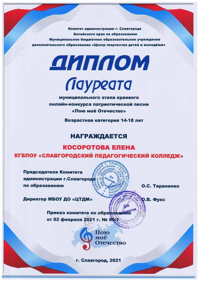 ![]() Победа в муниципальном этапе краевого конкурса Муниципальный этап краевого онлайн - конкурса патриотической песни «Пою мое Отечество» прошел в феврале 2021 года в ЦТДМ г. Славгорода. На суд жюри конкурса, главной целью которого является духовно нравственное и патриотическое воспитание детей и молодежи средствами музыкального искусства, были представлены видеоролики с вокальными номерами от образовательных организаций нашего города. Славгородский педагогический колледж в этом конкурсе представляли 4 конкурсанта: студентка 25 группы Екатерина Мельникова, студентка 21 группы Елена Косоротова, студентка 31 группы Любовь Ильченко и студент 31 группы Андрей Кен. От всей души поздравляем наших вокалистов с успешным выступлением: по итогам конкурса Лауреатами стали Любовь Ильченко и Елена Косоротова, Дипломом 1 степени награждена Екатерина Мельникова, Дипломом 2 степени – Андрей Кен. ![]() ![]()