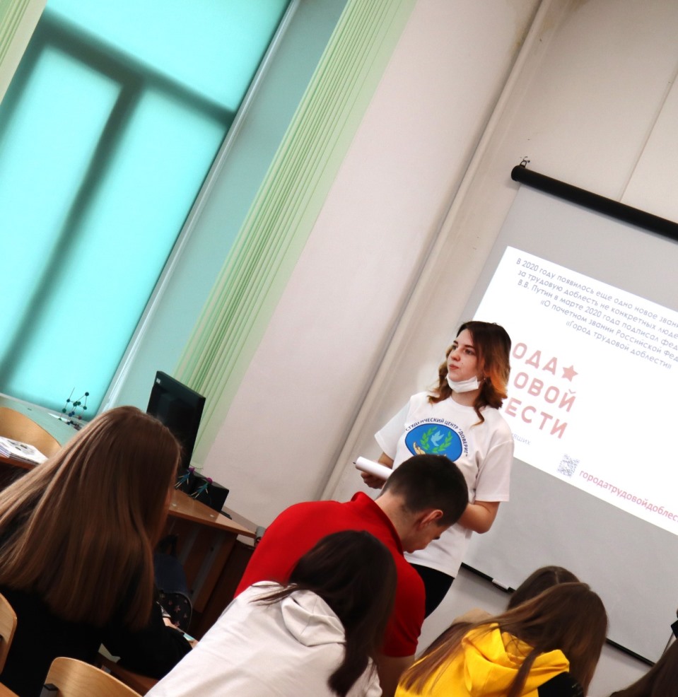 ![]() Всероссийские уроки трудовой доблести 29 марта 2021 года в КГБПОУ «Славгородский педагогический колледж» для студентов нового набора прошли «Уроки трудовой доблести». Уроки состоялись в рамках всероссийского просветительского проекта ОНФ «Трудовая доблесть России», призванного поддержать практику чествования людей труда в России. В этом году такой практике исполняется 100 лет. Сотрудницы студенческого центра «Доверие» (студентки 21 группы Екатерина Лучшева, Виктория Шефер, Анастасия Штоль, Екатерина Вознева и Дарья Бондаренко) рассказали студентам о возникновении в СССР стахановского движения и о том, как оно стало массовым движением новаторов социалистического производства, многократно превышавших установленные нормы. Студенты узнали о трудовой доблести советского народа в годы Великой Отечественной войны, о Героях Социалистического Труда послевоенного времени, а также о Героях Труда современной России. Сотрудники центра рассказали ребятам и о новом звании, которое появилось в 2020 году и отмечает за трудовую доблесть не конкретных людей, а целые города. В марте 2020 года В.В. Путин подписал федеральный закон «О почетном звании Российской Федерации «Город трудовой доблести»».