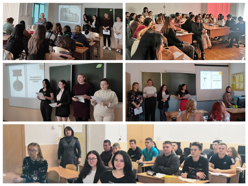 ![]() Тематические информационные часы Для студентов 1-3 курсов в октябре месяце были проведены тематические информационные часы в форме «Информация +» по теме «Заслуженные учителя Славгородского педагогического колледжа». Под руководством Н.А. Булгаковой информационные часы подготовили и провели участники клуба «Наследие»: Синяговская Юлия, Мантлер Алина, Менцер Анна, Батова Алина, Кушнерова Екатерина. В ходе этих уроков студенты познакомились с великим трудом не одного поколения преподавателей. Это те преподаватели, кем гордился и гордится каждый, кто работал и работает, учился или учится в педагогическом колледже. Это рассказы о педагогической деятельности педагогов, так или иначе связанных общей историей Славгородского педагогического колледжа. Замечательных педагогов в колледже много, они должны остаться в памяти, стать историей. Нельзя забывать, что историю делают, прежде всего, люди. ![]()