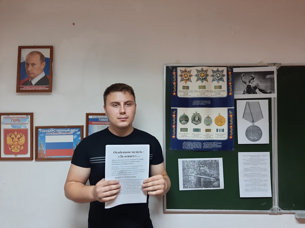 ![]() Награда за личный подвиг! Среди студентов общежития была проведена викторина «Особенная медаль», из которой студенты узнали историю медали и подвиги тех людей, которые были награждены ею. Медаль «За отвагу» — высшая медаль в наградной системе СССР, учреждена Указом Президиума ВС СССР от 17.10.1938 года. С момента своего появления стала особо уважаемой и ценимой среди фронтовиков, поскольку ею награждали исключительно за личную храбрость, проявленную в бою. Это главное отличие медали «За отвагу» от некоторых других медалей и орденов, которые нередко вручались «за участие». В преддверии юбилея колледжа студенты знакомятся с историей нашего учебного заведения. Фотографии, документы тех лет помогают ребятам лучше представить, как всё начиналось в далёком 1926 году, когда из-за нехватки кадров и для ликвидации неграмотности было открыто наше училище. Вспоминают тех выпускников, кто прошёл самую страшную в истории человечества войну и благодаря которым мы живём. Среди выпускников, награждённых медалью « За отвагу», – Смольков Ревлий Николаевич (единственный из живых свидетелей той кровопролитной войны), Герой Советского Союза Геннадий Андреевич Приходько. Трижды удостоенный этой награды – Гладько Николай Григорьевич. В числе награждённых– М.М. Гаврилов, В.П. Бирюк, Н.Ф. Клищенко, В.П. Алексеев, К.И. Сирота, В.Г. Ищенко, В.С. Абарин, Ф.И. Даниленко. Студенты первого курса узнали также о том, где можно получить информацию об этих героях, изучив новостную ленту музея СПК. ![]()