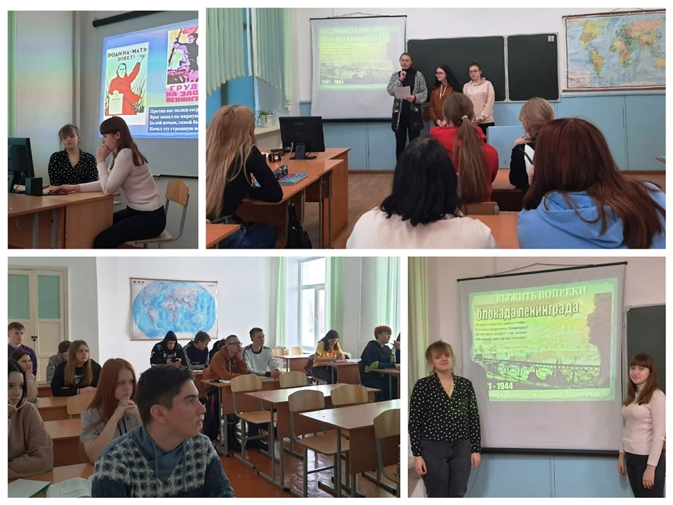 ![]() 27 января День снятия блокады Ленинграда Ровно 78 лет назад, в 1944 году, 27 января советские войска провели операцию, в результате которой гитлеровские оккупанты были отброшены от Ленинграда. Блокада Ленинграда во время Великой Отечественной войны длилась с 8 сентября 1941 года по 27 января 1944 года, ровно – 872 дня. 28 января в Славгородском педагогическом колледже прошли уроки мужества «Выжить вопреки». Студенты клуба «Наследие», готовя материал по этой теме, попытались достоверно отобразить жизнь ленинградцев в годы блокады, показав эвакуацию мирных жителей, армию народного ополчения, оборонительные сооружения, артобстрел, первые бомбы, сброшенные на город, голод, норму хлеба в 125 грамм, ленинградскую болезнь «дистрофию», смерть людей на улицах, фрагменты дневника Тани Савичевой, дорогу жизни, школьные занятия и доблестный труд подростков и женщин и др. Те, кто пережил блокаду, были обычными людьми. Они сумели совершить невозможное - пережить ледяной ад. И не только пережить, но и остаться людьми. Они уходят, и вместе с ними уходит история. От нас зависит, чтобы она не ушла навсегда… ![]()