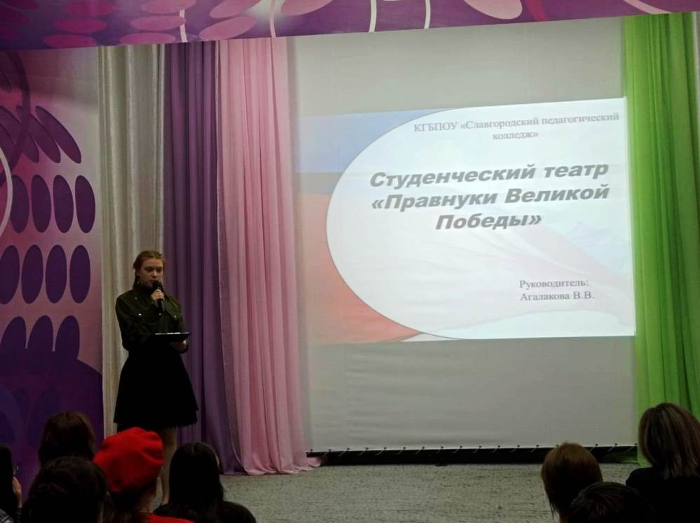 ![]() Победа в городском конкурсе волонтерских объединений Студенческий волонтерский отряд Славгородского педагогического колледжа занял 1 место в городском конкурсе волонтерских объединений «85 лет Алтайскому краю». В ходе конкурса студенты 21 группы Алина Мантлер и Константин Тищенко представили проект «Студенческий театр «Правнуки великой Победы» (рук. В.В.Агалакова). Студенты - волонтеры, являющиеся участниками проекта, готовят театральные постановки патриотической направленности, большей частью – о судьбах участников Великой Отечественной войны, в том числе студентов Славгородского педагогического училища. Впервые ребята сделали постановку по роману Александра Фадеева «Молодая гвардия», затем показали зрителям спектакль «Защитим Зою», посвященный бессмертному подвигу Зои Космодемьянской - первой из женщин, удостоенной звания Героя Советского Союза. Костя и Алина показали зрителям и жюри отрывок из постановки «Я из будущего», повествующей о том, как юноша из нашего колледжа попал в прошлое и познакомился со студентами Славгородского педагогического училища, которые в страшные годы войны ушли на фронт защищать свою Родину. Этот спектакль – о жизни двух студентов Славгородского педагогического училища, погибших в годы войны – Валентины Колесниковой (Благовещенский район) и Михаила Цыся (Суетский район).
