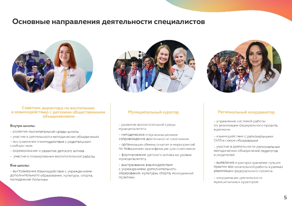 Глава Росдетцентра Александр Кудряшов также рассказал, что по мере развития проекта советники будут осваивать новые роли и направления развития: «Наша управленческая модель включает в себя не только советников, есть муниципальные координаторы, которые отвечают за коммуникацию среди школ, внутри муниципалитета, это региональные координаторы, которые являются проводниками повестки воспитания, которая реализуется внутри субъекта. У нас появятся советники-методисты, которые уже сейчас вовлечены в аккумулирование лучших практик, они создают методические материалы, благодаря которым мы расширяем ту палитру возможностей, которая дает возможность советникам вести воспитательную деятельность. Также появятся советники-наставники». На пресс-конференции, посвященной конкурсу 26 апреля в ТАСС, первыми итогами и впечатлениями от работы поделилась Юлия Стеценко — советник директора по воспитанию и работе с детскими общественными объединениями гимназии №7 г. Брянска: «Я не представляю свою жизнь без этой удивительной работы. Каждое мероприятие – уникально, и каждый ребёнок найдёт то, что ему по душе, а советники и лидеры РДШ – настоящие навигаторы, которые всегда смогут заинтересовать ребёнка различными видами деятельности. Например, в нашей гимназии помимо основных календарных мероприятий, мы проводим различные акции, например, «Лапка друга», «Бумажный бум». Группа активистов создала свой танцевальный коллектив, который уже завоевал признание на областном уровне. В Дни единых действий и больших событий ребята проводят тематические музыкальные перемены для учащихся начальной школы. Также в нашей гимназии действует Медиашкола, участники которой освещают все мероприятия и события в гимназии». Инструкция о том, как подать заявку на конкурс по ссылке. Справочно: Конкурс реализуется в рамках федерального проекта «Патриотическое воспитание граждан Российской Федерации» национального проекта «Образование». С 2021 года должность советника по воспитанию и работе с детскими общественными объединениями внесена в номенклатуру должностей, разработаны квалификационные требования к ней. В прошлом году обучение по программе повышения квалификации «Воспитание в образовательной организации» прошли 2,5 тысячи человек – участников конкурса. Советники в 2219 школах страны провели мониторинг воспитательной работы и определили приоритетные направления развития в них. По итогам деятельности советников 2021 году в дальнейшем планируется создать первичные отделения Российского движения школьников в 300 школах, а также 250 медиацентров, 250 спортивных клубов, 200 музеев, 150 театров, 60 туристических клубов. По инициативе и при поддержке советников была запущена программа развития социальной активности учащихся начальных классов «Орлята России». В текущем учебном году она охватила 60 тысяч учеников младшей школы, в следующем году в мероприятия планируется вовлечь 1 млн детей.