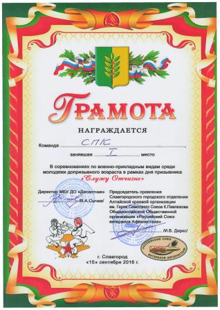 15 сентября 2016 года на базе ВПК «Десантник» прошли городские соревнования по военно-прикладным видам среди молодежи допризывного возраста в рамках Дня призывника «Служу Отечеству». По итогам соревнований убедительную победу в них одержала команда Славгородского педагогического колледжа (Дмитрий Артемьев, Юрий Мещанинцев, Максим Пчелин, Геннадий Бабиев, Виталий Фролов, Вячеслав Кулешов, Денис Недобитков) под руководством Алексея Владимировича Хохлова. Наша команда выиграла пять конкурсов из шести: «Снайпер», «Метание гранаты РГД – 5 в цель», «Сильный и ловкий», «Летний биатлон», «Преодоление общевойсковой полосы препятствий» и по результатам всех конкурсов стала чемпионом. От всей души поздравляем наших парней с этой заслуженной победой! Мы вами гордимся!