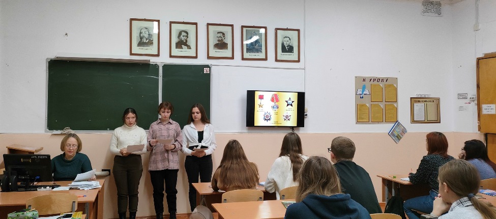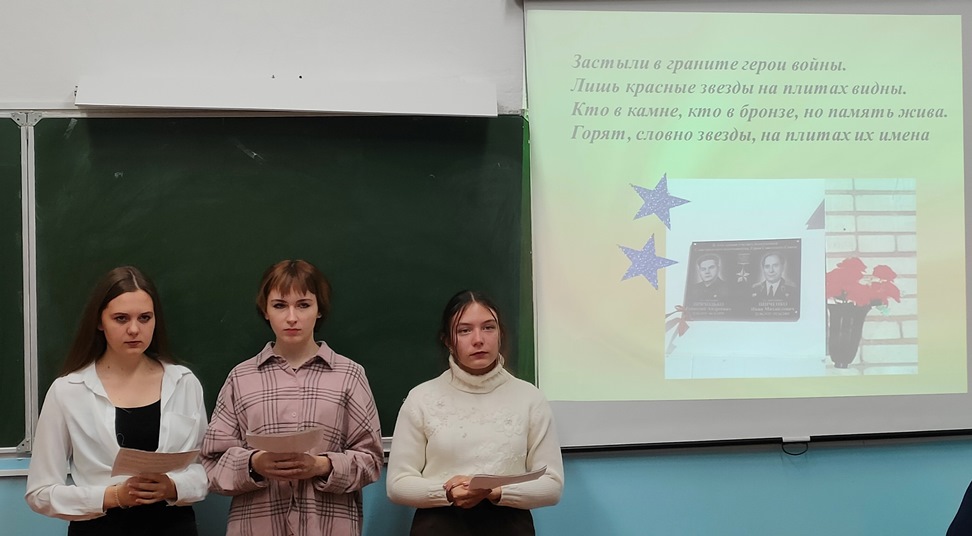![]() День Героев Отечества День Героев Отечества - это памятная дата, которая отмечается ежегодно 9 декабря с 2007 года. Она установлена Федеральным законом Российской Федерации «О днях воинской славы и памятных датах России». Свою историю эта памятная дата ведёт ещё с 18 века. Эта памятная дата приурочена к выдающемуся событию эпохи правления императрицы Екатерины II. В 1769 году она учредила орден Святого Георгия Победоносца. В этот день чествуют Героев Советского Союза, Российской Федерации, кавалеров ордена Святого Георгия Победоносца и обладателей трех степеней ордена Славы. В этот день россияне не только отдают дань памяти совершившим подвиги предкам, но и чтят ныне живущих героев нашей Родины. Для студентов 1-2 курсов информационные часы «День Героев Отечества» провели Булгакова Н.А. и студенты клуба «Наследие» Зейналова Карина, Гончаренко Валентина и Масликова Ангелина. В ходе мероприятий студенты познакомились с историей возникновения этой памятной даты и подвигами наших выпускников Героев Советского Союза: Зинченко Ивана Михайловича, Приходько Геннадия Андреевича и полного кавалера ордена Славы Иванова Ивана Фёдоровича. Мы помним, чтим и гордимся нашими выпускниками. Студенты минутой молчания почтили память всех солдат, защищавших наше Отечество. Автор: Булгакова Н.А. Фото автора
