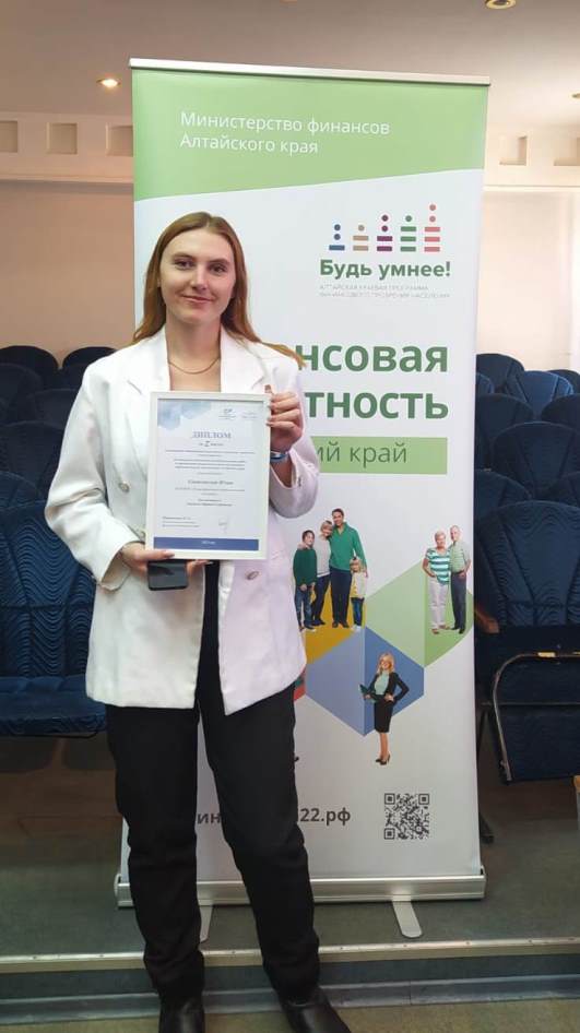 ![]() Студентка Славгородского педагогического колледжа – победитель регионального Конкурса исследовательских работ по финансовой грамотности 17 февраля на площадке Алтайского филиала Финансового университета при Правительстве Российской Федерации состоялся заключительный этап и награждение победителей регионального Конкурса исследовательских работ по финансовой грамотности среди обучающихся образовательных организаций Алтайского края, организованного в рамках реализации государственной программы Алтайского края «Повышение уровня финансовой грамотности населения в Алтайском крае». В конкурсе участвовали обучающиеся из 25 образовательных организаций 14 муниципальных образований Алтайского края. К очному этапу были допущены участники, представившие лучшие работы, по мнению экспертов-членов жюри. В рамках очного этапа финалисты презентовали и защищали свои работы. От Славгородского педагогического колледжа в конкурсе приняла участие Синяговская Юлия, студентка 31 группы школьного отделения. На конкурс была представлена работа «Использование активных методов обучения при формировании понятий младших школьников о семейном бюджете» (руководитель Кинцель М.Г.). По итогам первого этапа работа Юлии вышла в финал, а после выступления на очном этапе в номинации «Финансовая грамотность населения: проблемы и пути решения» была награждена Дипломом за I место, руководитель был отмечен Благодарственным письмом. Экспертами Конкурса выступили представители Алтайского института развития образования им. А.М. Топорова, Отделения по Алтайскому краю Сибирского главного управления Банка России, Ассоциации «Алтайский территориальный институт профессиональных бухгалтеров и аудиторов», Алтайского филиала Финансового университета при Правительстве Российской Федерации, Управления Федеральной службы по надзору в сфере защиты прав потребителей и благополучия человека по Алтайскому краю. Каждый участник получил ценные комментарии от экспертов и рекомендации для дальнейшей работы в изучении финансовой грамотности. Автор: Кинцель М.Г. Фото предоставлены автором