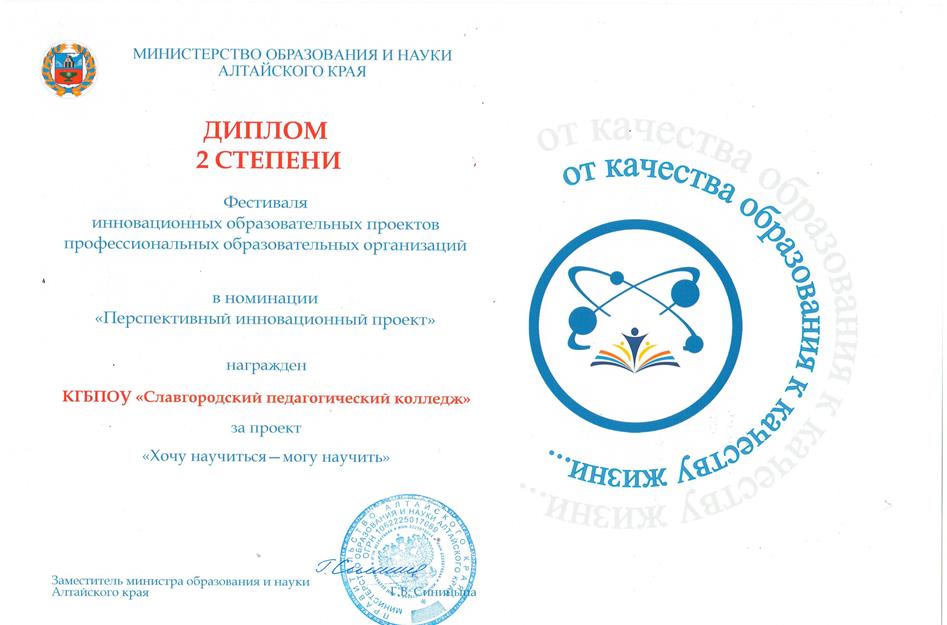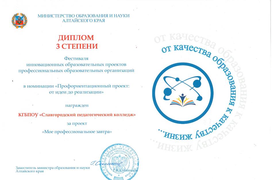 ![]() Славгородский педагогический колледж в числе победителей краевого конкурса-фестиваля инновационных образовательных проектов 11 апреля в рамках деловой программы Регионального этапа чемпионата по профессиональному мастерству «Профессионалы» Алтайского края состоялось награждение победителей конкурса-фестиваля инновационных образовательных проектов профессиональных образовательных организаций Алтайского края. Для экспертной оценки было представлено 49 проектов из 28 профессиональных образовательных организаций. Организаторами фестиваля являются Министерство образования и науки Алтайского края совместно с факультетом развития профессионального образования Алтайского института развития образования имени Адриана Митрофановича Топорова. Целью проведения фестиваля является развитие, поддержка и сопровождение инновационной деятельности профессиональных образовательных организаций Алтайского края в условиях модернизации среднего профессионального образования. От Славгородского педагогического колледжа на конкурс-фестиваль было представлено два проекта – «Мое профессиональное завтра» в номинации «Профориентационный проект: от идеи до реализации». Это успешная педагогическая практика, в рамках которой команда проекта ежегодно с 2019 года проводит краевой конкурс индивидуальных проектов студентов 1-2 курса ПОО Алтайского края, ориентированный на укрепление профессиональной социализации и познание особенностей своей будущей профессии. Проект отмечен дипломом III степени. В номинации «Перспективный инновационный проект» был представлен проект «Хочу научиться – могу научить», который является особой гордостью педагогического коллектива, он включен в реестр региональных инновационных проектов по направлению «Развитие механизмов управления качеством образования» (приказ Министерства образования Алтайского края №327 от 15.03.2022 г.). Работы в рамках проекта ориентированы на создание колледжной системы открытого наставничества и закрепления начинающих преподавателей на первом рабочем месте. Проект отмечен Дипломом II степени. Стоит отметить, что реализация проекта имеет особую актуальность в Год педагога и наставника. 17 апреля команда проекта проводит стажерскую практику для кураторов наставничества школ г. Славгорода, техникумов и лицеев Западного территориального отделения совета директоров СПО Алтайского края. На стажерской практике будет представлен опыт работы колледжа по формам наставничества «студент – студент» и «студент – преподаватель». Автор: Кинцель М.Г. Фото предоставлены автором