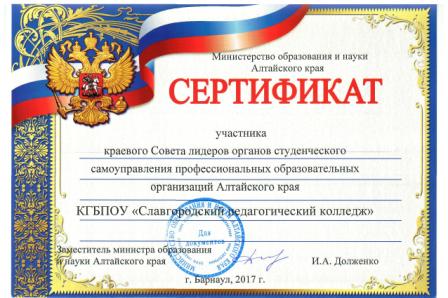9 февраля 2017 года на базе КГБПОУ «Алтайский государственный колледж» состоялся краевой совет лидеров органов студенческого самоуправления профессиональных образовательных организаций. Славгородский педагогический колледж на нем представляла лидер студенческого центра «Доверие», студентка 23 группы Ирина Вернер под руководством заместителя директора по воспитательной работе В.В.Агалаковой. Лидеры студенческого самоуправления Алтайского края выбрали председателя краевого совета, поделились друг с другом опытом работы по направлениям «Студенческое самоуправление» и «Волонтерство», а также приняли участие в психологическом тренинге «Лидер – это наш выбор!». Для руководителей делегаций прошел круглый стол «Студенческое самоуправление: опыт, практика, перспективы».