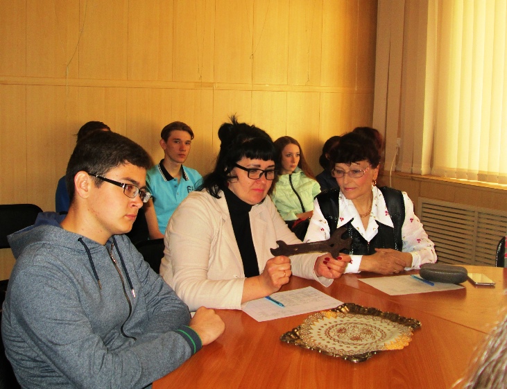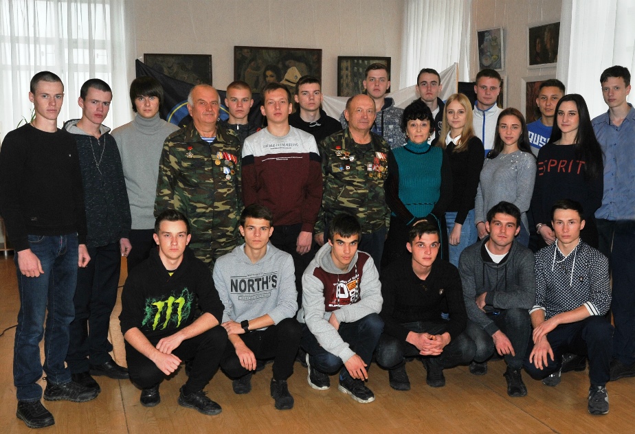 Встреча с воинами-афганцами На базе колледжа действует региональная инновационная площадка «Школа проектирования». В прошлом учебном году в рамках работы школы студент 16 группы Алексей Данилюк познакомил проектную группу со своим проектом «Афганский след в моей семье», где он рассказал о своём отце, который проходил службу в Афганистане. В этом учебном году студенты 26 группы встретились с Данилюком Н. Г. и офицером Советской армии Мареничем А.М., который также выполнял служебный долг за пределами Отечества в ДРА.