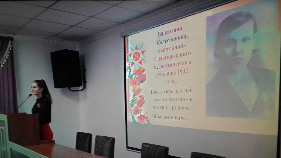 Виктория Кулыгина, студентка 21 группы, свою работу «Солдатский треугольник с фронта» посвятила выпускнице 1942 года Славгородского педучилища Вале Колесниковой, добровольно ушедшей на фронт и погибшей в боях за Смоленщину 3 марта 1943 года. А после гибели у неё нашли письмо друзьям, маме... Информация о проведённом мероприятии содержится на официальном сайте Славгорода, газете «Славгородские вести», в новостном выпуске телеканала «ТВ «Степь» от 06 марта 2020 года