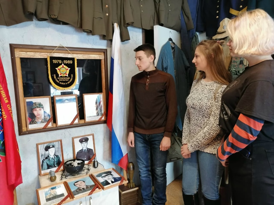 Радиостанции, средства защиты, карты, боеприпасы и обмундирование, оружие, мины, награды и документы солдат… Маленькое пространство зала вмещает так много всего… Узнать всё о войне, которая длилась почти долгих 10 лет, конечно, не удалось, но для ребят предстала не «книжная», а «живая» история тех лет. Именно живая, потому что живы те, кто воевал в Афганистане, Чечне, других “горячих точках”. Живая, потому что память о погибших свято хранят их товарищи по оружию, их семьи и близкие. И память эта жива, пока мы об этом помним!