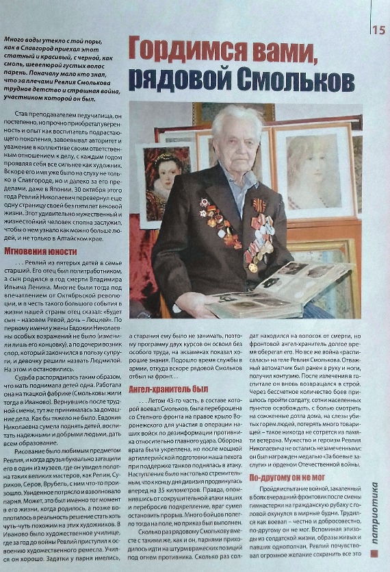 Гордимся Вами В рамках проекта "Славгород. Славная летопись" на сайте городской администрации размещается информация о ветеранах Великой Отечественной войны и о вручении им юбилейных медалей к 75 - летию Великой Победы! Великая Отечественная война 1941 - 1945 гг. стала примером героизма и мужества нашего народа в борьбе с врагом! И об этом важно помнить! Нужно гордиться каждым ветераном! Ревлий Николаевич Смольков - инвалид Отечественной войны, ветеран педагогического труда, преподаватель Славгородского педучилища. Свидетельством жизненных побед стали награды ветерана. Фронтовик награждён орденом Отечественной войны I степени, медалями «За отвагу», «За победу над Германией в ВОВ 1941-1945гг.» Сегодня ветерану 95 лет! Глава города Горбунов С.В. вручил Ревлию Николаевичу юбилейную медаль. Информация о мероприятии содержится на официальном сайте Славгорода.
