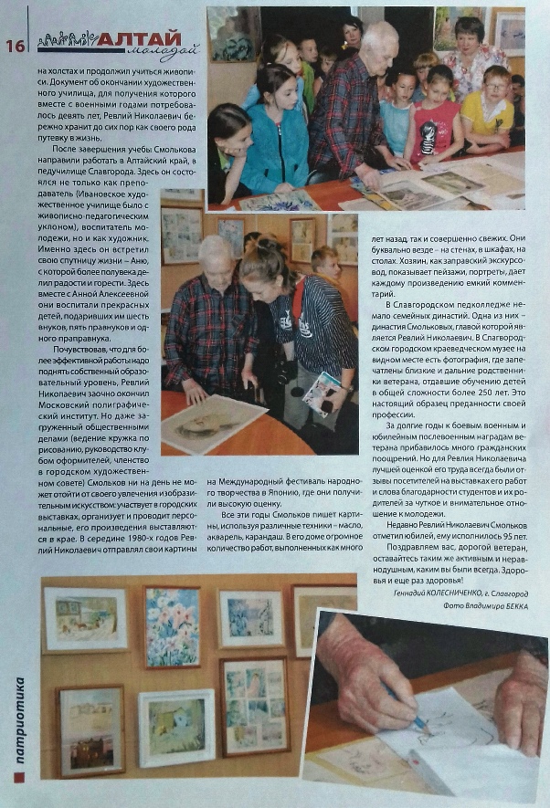На пути к Победе… В течение месяца студенты педагогического колледжа посещали персональную выставку работ ветерана Великой Отечественной войны, ветерана педагогического труда, бывшего преподавателя педучилища, художника Ревлия Николаевича Смолькова. К 95 –летию художника МБУК «Славгородский городской краеведческий музей» открыл выставку картин юбиляра «На пути к Победе».