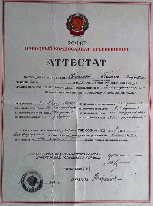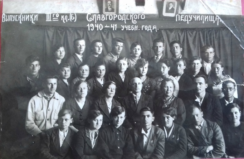 Главную задачу училище решало успешно! Годы войны принесли педучилищу тяжёлые испытания. На фронт были мобилизованы почти все преподаватели мужчины. Занятия проходили в три смены. Для поддержания формы с 24 сентября перед началом занятий была введена обязательная физзарядка. О войне напоминали госпитали, под которые были заняты учебные здания. Учащиеся педучилища осуществляли постоянное шефство над госпиталями, часто ночью перевозили с железнодорожной станции раненных, навещали их в госпитале, читали раненым газеты и журналы, писали письма домой, организовывали концерты, был основан фонд помощи фронтовикам (по квартирам собирали подарки). Учащимся приходилось выполнять все хозяйственные работы. Особенно сложной и трудоёмкой была заготовка дров, за которыми даже зимой ездили за несколько десятков километров; привлекали студентов к расчистке аэродрома. Все эти тяготы жизни мужественно переносили и преподаватели. Они всегда и везде находились с учащимися, участвовали во всех студенческих мероприятиях, вместе веселились и грустили. В классах было не только тесно, но холодно и темно. Освещение давали керосиновые лампы - "коптилки", которые часто гасли из-за нехватки кислорода в классах. Война наложила отпечаток на все стороны жизни училища. Бумага для письма вообще отсутствовала, тетради делали из газет или писали между книжными строчками карандашами, так как от ручек отказались в связи с тем, что зимой чернила не выдерживали низкой температуры и застывали. Часто не выдерживали сильных морозов и полуголодные студенты. В такие дни приходилось сокращать уроки до 20-ти минут. Учебники отсутствовали, записывали объяснения учителя, потом отвечали по конспектам. Ребята по карточкам получали по 400 граммов хлеба в сутки. Стипендию платили всем успевающим, к тому же она увеличивалась с каждым курсом: от 80 рублей на первом до 120 рублей на третьем. Большое внимание уделялось военной подготовке. Военная подготовка шла по программе военного Министерства. Изучалось строевое дело, военно-санитарное дело, боевое оружие. Учащиеся были организованы по образцу военных подразделений: рота, взвод, отделение во главе с командирами. Это была серьёзная военная подготовка по Уставу Красной Армии. Но, несмотря на все трудности, которые приходилось преодолевать в годы войны, свою главную задачу - задачу подготовки учителей, училище решало успешно! Из стен училища ежегодно выпускались учителя. Все верили: будет победа, будет жизнь, будут дети, и будет, кому их воспитывать и учить! Гонтарь Мария Андреевна – выпускница 1944 года. Работала учителем начальных классов, была заместителем директора школы № 13, директором школы № 4 города Славгорода. Награждена знаком «Отличник народного просвещения».