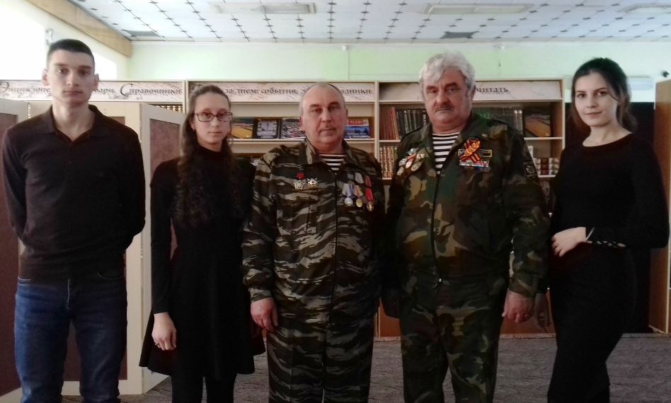 На встрече присутствовали ветераны войн в Афганистане и Чечне Леонид Мальцев и Владимир Антонов. Владимир Николаевич Антонов пишет стихи и с удовольствием поделился своим творчеством со зрителями. Минутой молчания почтили тех солдат, которые с честью выполнили интернациональный долг, но не вернулись домой.