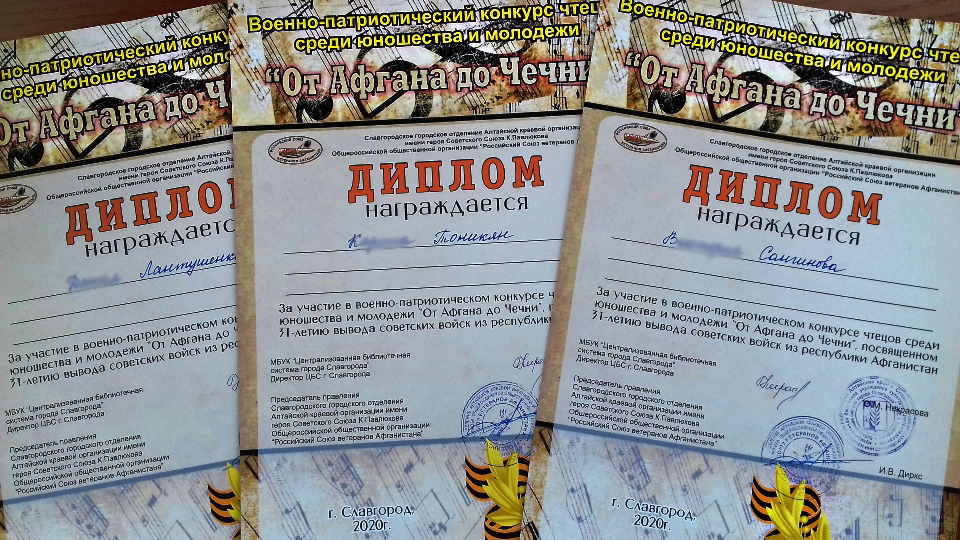 Конкурс был организован Центральной городской модельной библиотекой совместно со Славгородским городским отделением Алтайской краевой организации имени Героя Советского Союза Константина Павлюкова общероссийской общественной организации «Российский союз ветеранов Афганистана», председателем которой является депутат Алтайского краевого Законодательного Собрания И.В. Диркс. Помощник депутата Алтайского краевого Законодательного Собрания З.С. Посунько вручила дипломы и ценные подарки лучшим участникам конкурса. Подводя итоги встречи, З.С. Посунько выразила надежду на дальнейшее сотрудничество и участие в конкурсе ещё большего количества юных чтецов.