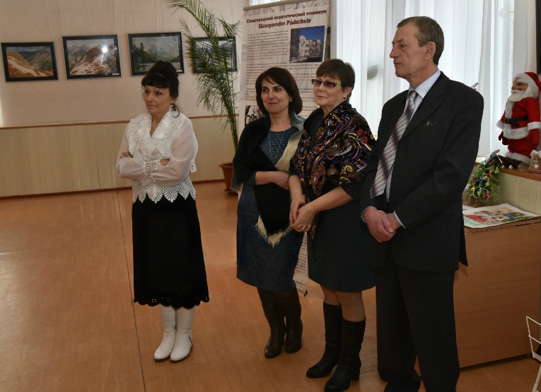 Встреча с Петером Бломайером Славгород посетил генеральный консул ФРГ в Новосибирске Петер Бломайер. Одно из основных направлений в командировке консула – российские немцы, именно поэтому он посетил территории, где они проживают. В городском краеведческом музее были выставлены экспонаты и оформлены экспозиции, посвящённые немецкой культуре и истории. Свою деятельность представили несколько учреждений, организации, в том числе и наше учебное заведение. В организации мероприятия приняли участие заведующая школьным отделением Славгородского педагогического колледжа, преподаватель немецкого языка Елена Александровна Сулимова, заместитель директора колледжа по учебно – воспитательной работе Марина Дмитриевна Никитина, руководитель музея СПК Стрельникова Ольга Александровна. В колледже прошла «Неделя Рождества в странах Европы», в ходе которой студенты изготовили много поделок и сувениров. Лучшие творческие работы студентов колледжа были представлены на выставку в МБУК «Славгородский краеведческий музей». На баннере «Славгородский педагогический техникум» можно было прочитать краткую информацию об истории образовательного учреждения, как на русском языке, так и на немецком.